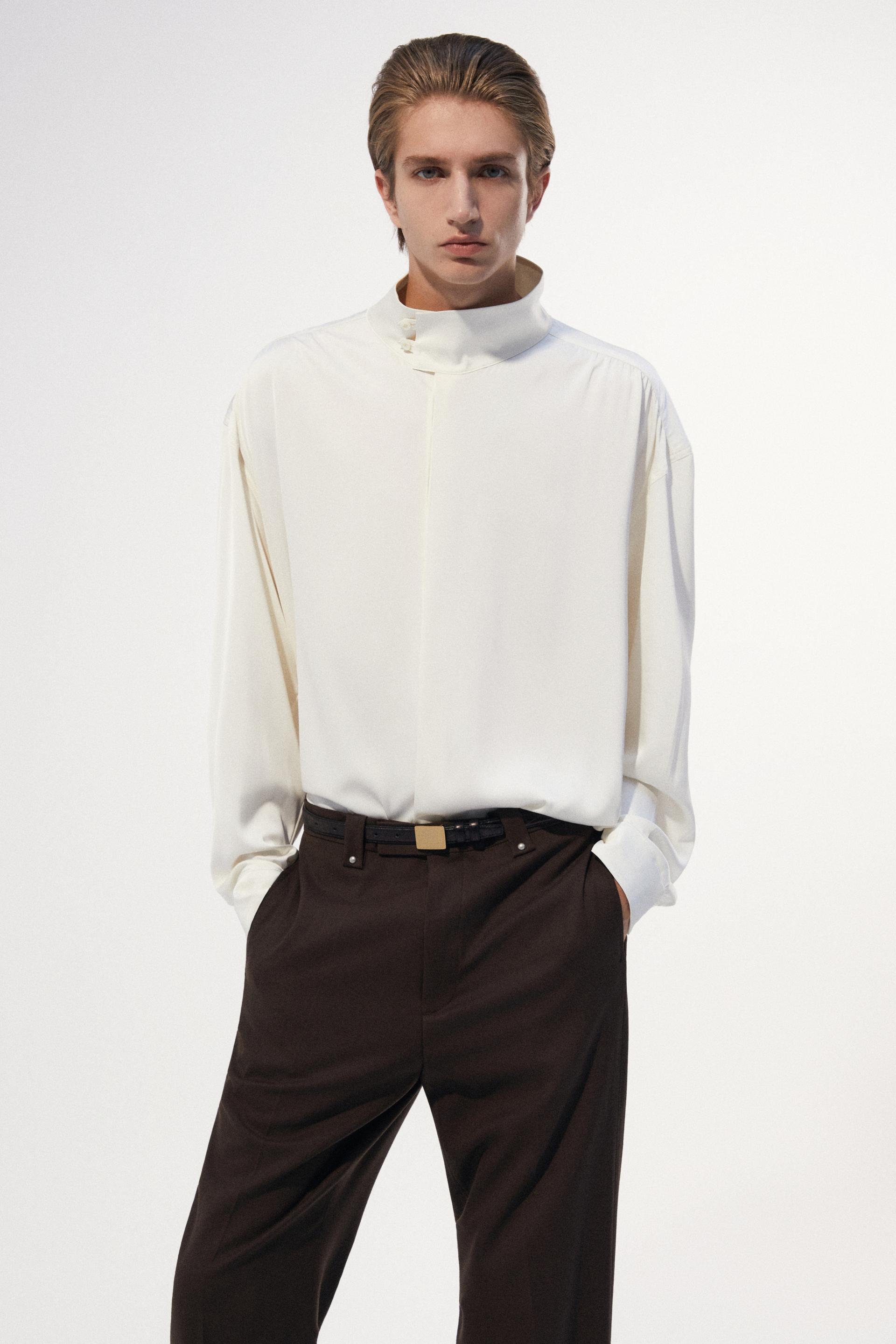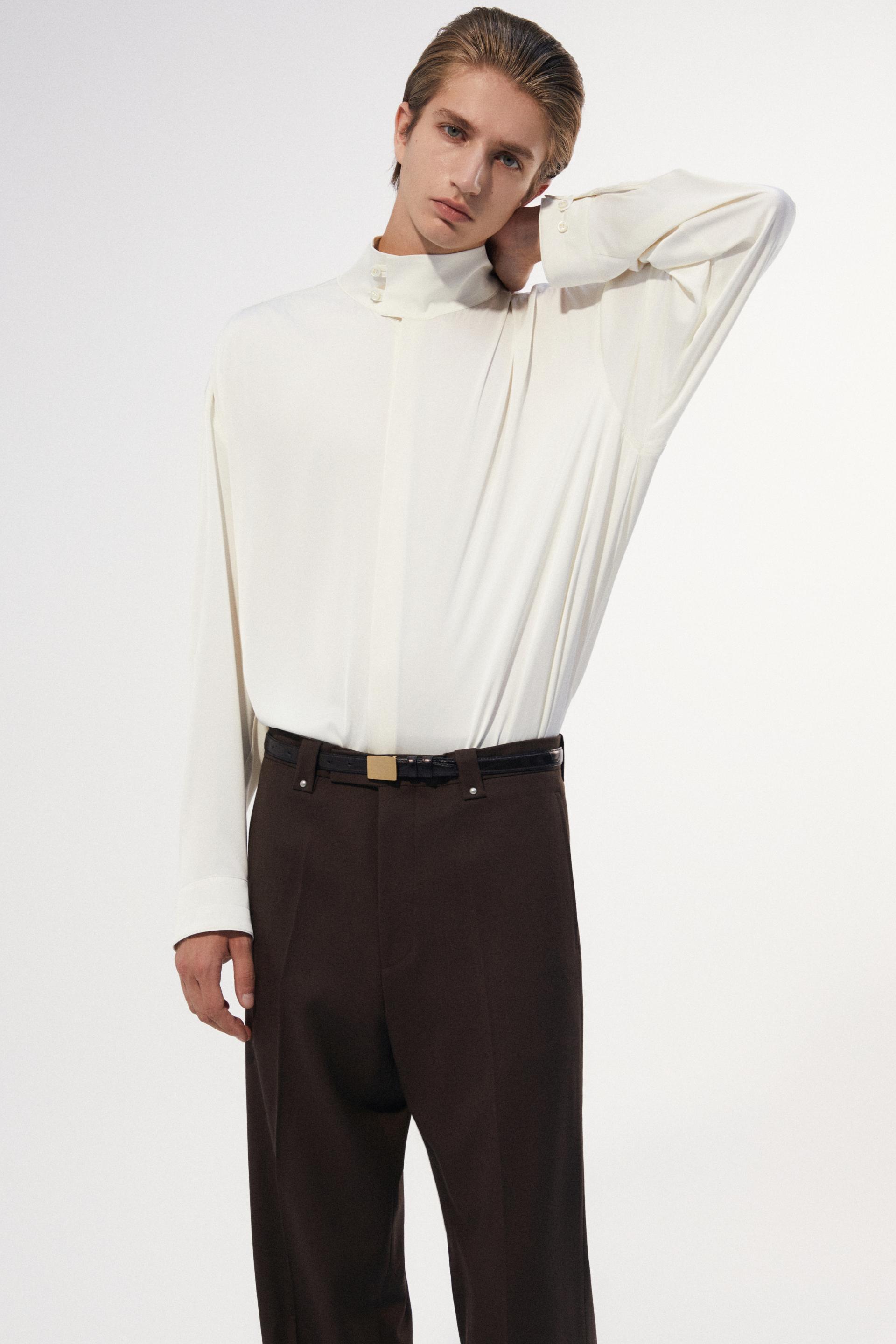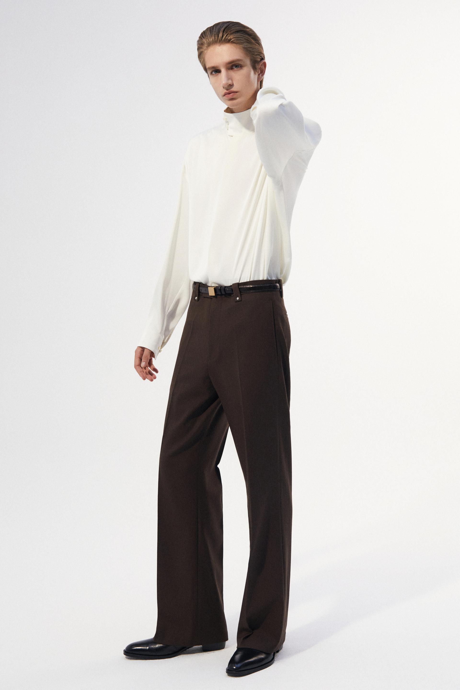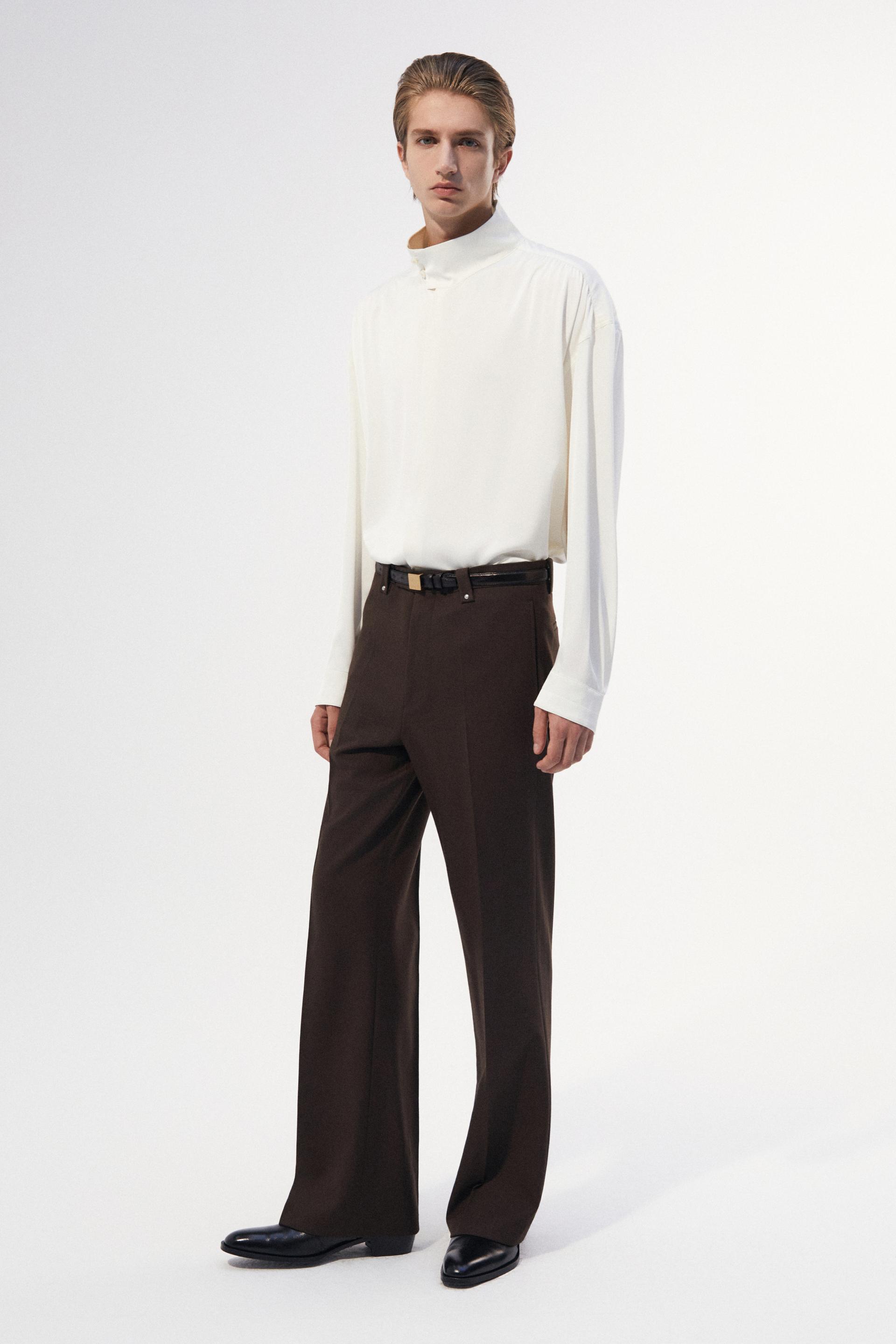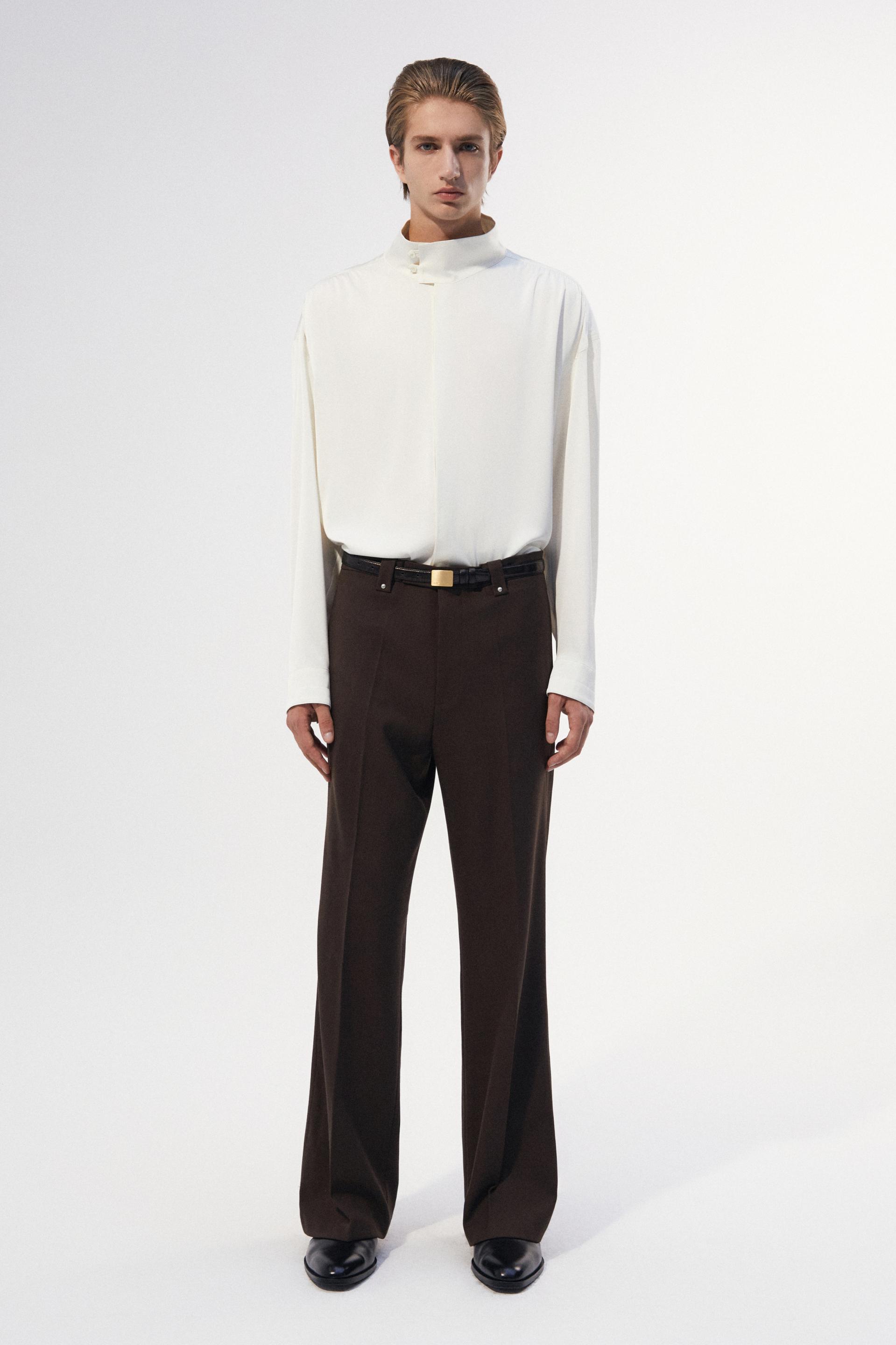 타일레 시그니처 아이템, 60년대 카나비 스트리트 룩에서 영감을 얻은 울 트라우저 입니다. 특유의 조직으로 터치와 회복이 우수한 높은 밀도 파인 울 혼방 패브릭을 사용했습니다. 밑단으로 넓어지는 와이드 플레어 실루엣과 벨트 루프에 더해진 콘초 스터드가 세련된 대비를 연출합니다. 내부 마감까지 테일러드 메이킹으로 완성한 하이 퀄리티 클래식 아이템입니다.