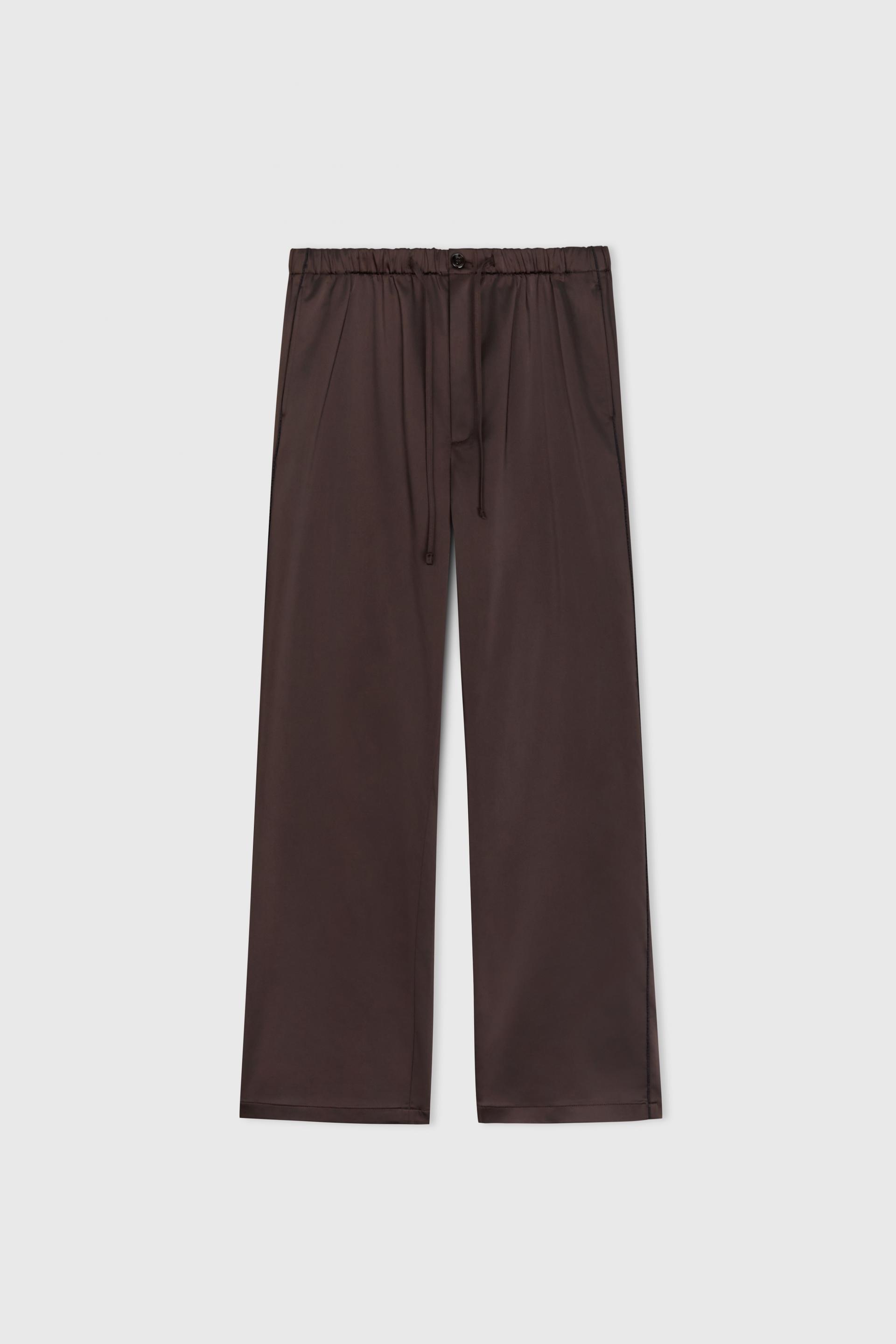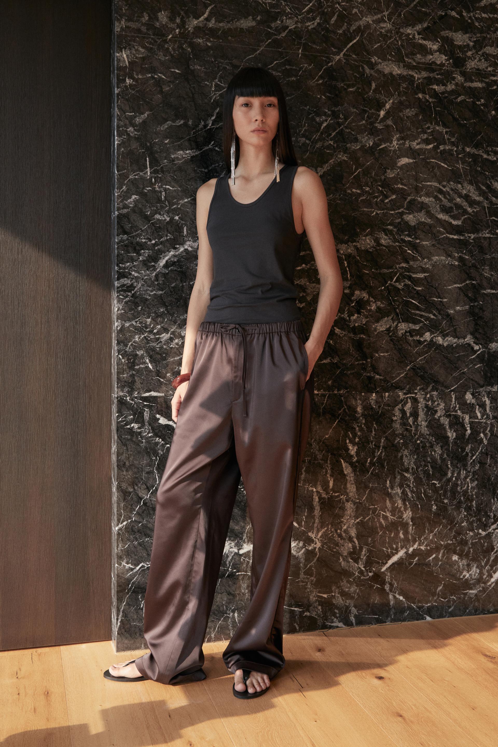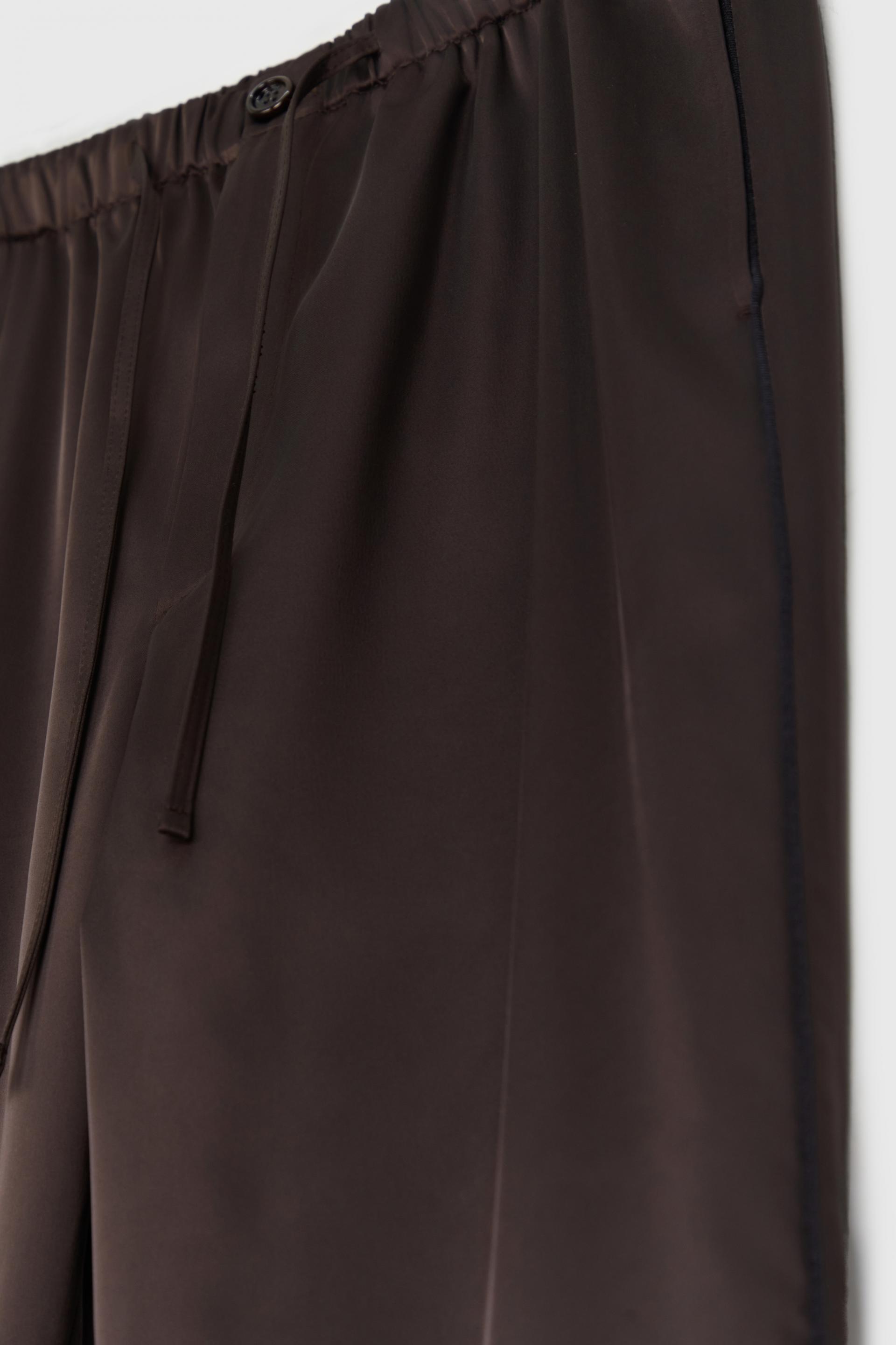 은은한 광택의 사틴 텍스처와 여유로운 실루엣이 조화를 이루는 테라짜 팬츠입니다. 섬세하게 짜여진 컴팩트 얀 헤비 사틴 소재는 편안하지만 드레시한 아웃핏은 물론 스포티 무드의 연출도 가능한 넓은 범용성이 특징입니다. 얇은 엘라스틱 밴드가 삽입된 허리선, 옆선에 더해진 파이핑 라인과 천연 너트버튼의 조화로운 매치가 특별한 아이코닉 아이템입니다.