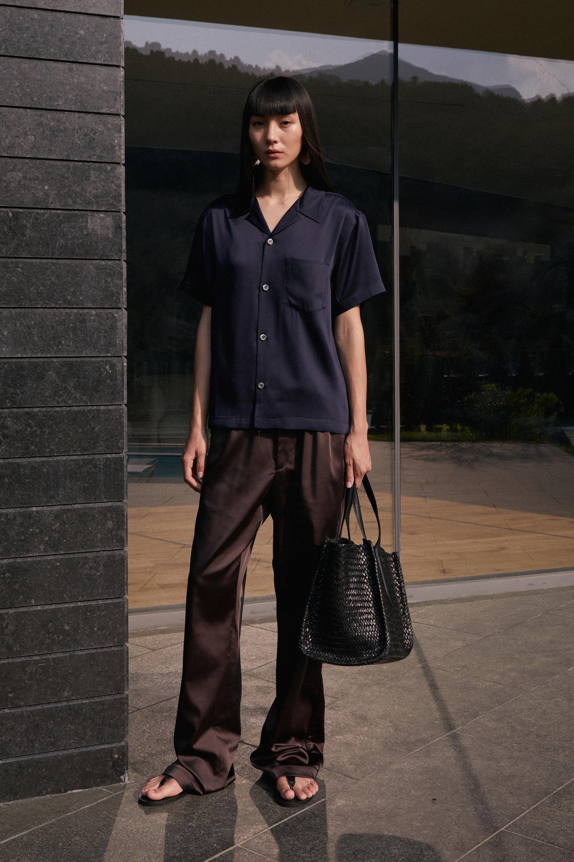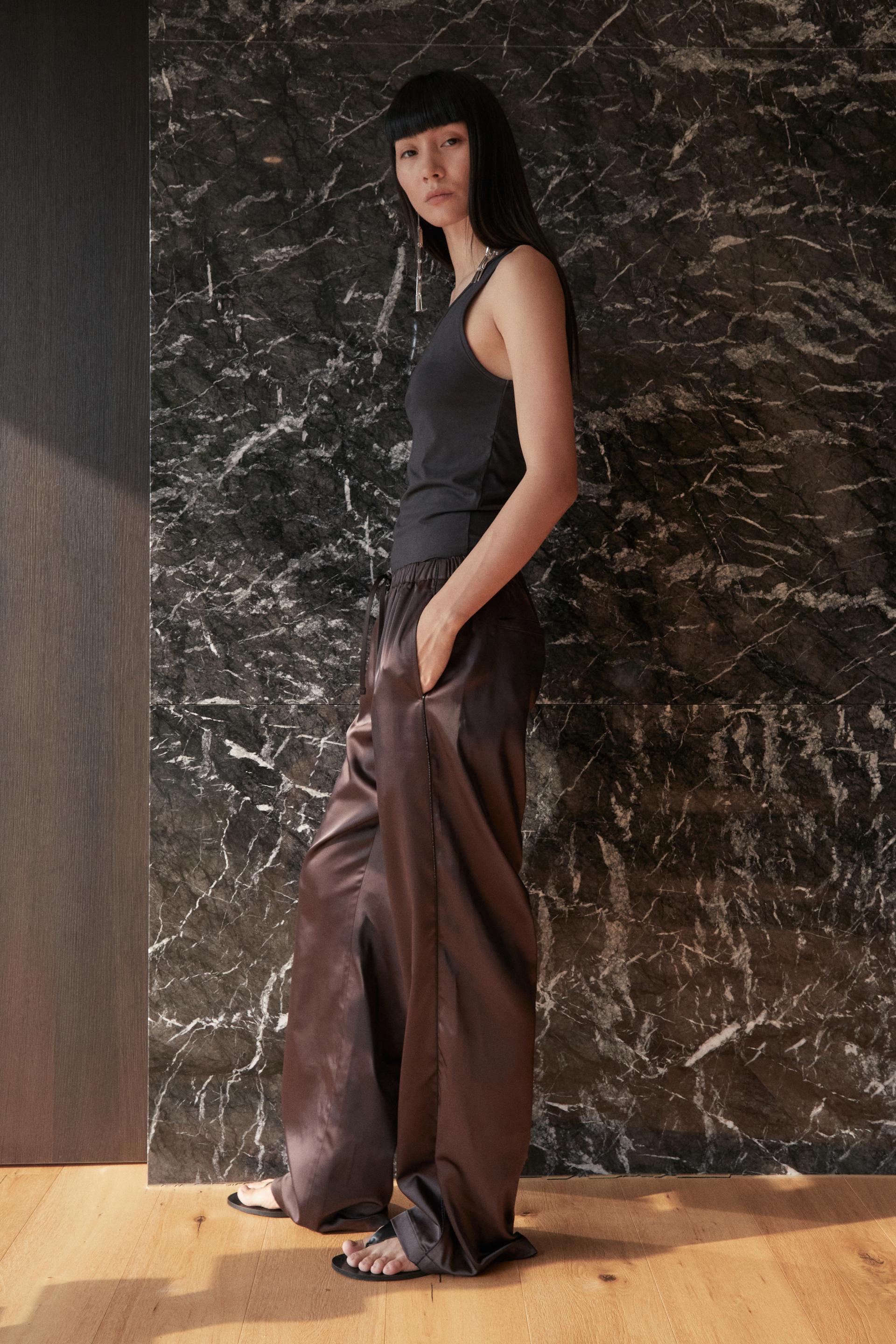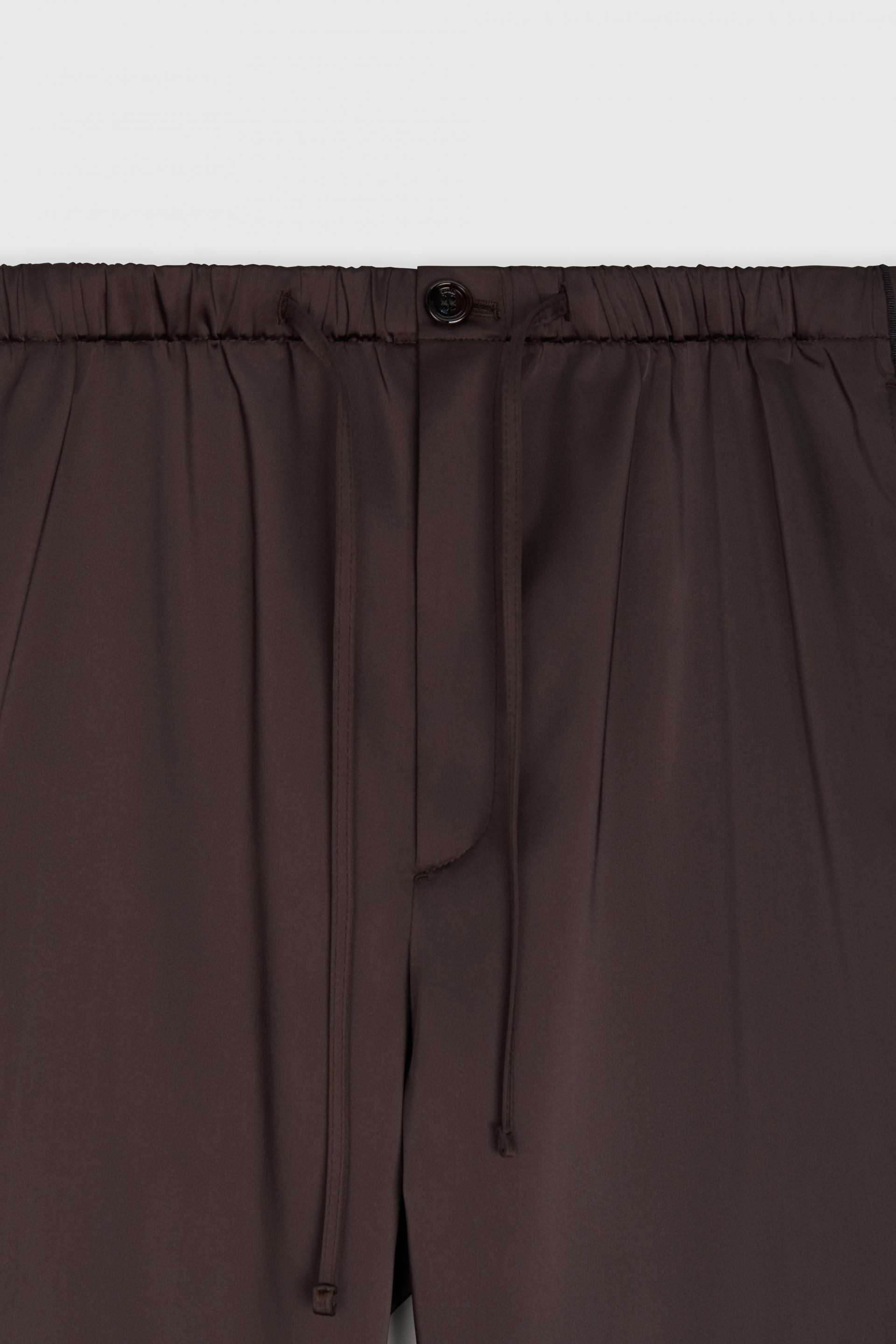 은은한 광택의 사틴 텍스처와 여유로운 실루엣이 조화를 이루는 테라짜 팬츠입니다. 섬세하게 짜여진 컴팩트 얀 헤비 사틴 소재는 편안하지만 드레시한 아웃핏은 물론 스포티 무드의 연출도 가능한 넓은 범용성이 특징입니다. 얇은 엘라스틱 밴드가 삽입된 허리선, 옆선에 더해진 파이핑 라인과 천연 너트버튼의 조화로운 매치가 특별한 아이코닉 아이템입니다.