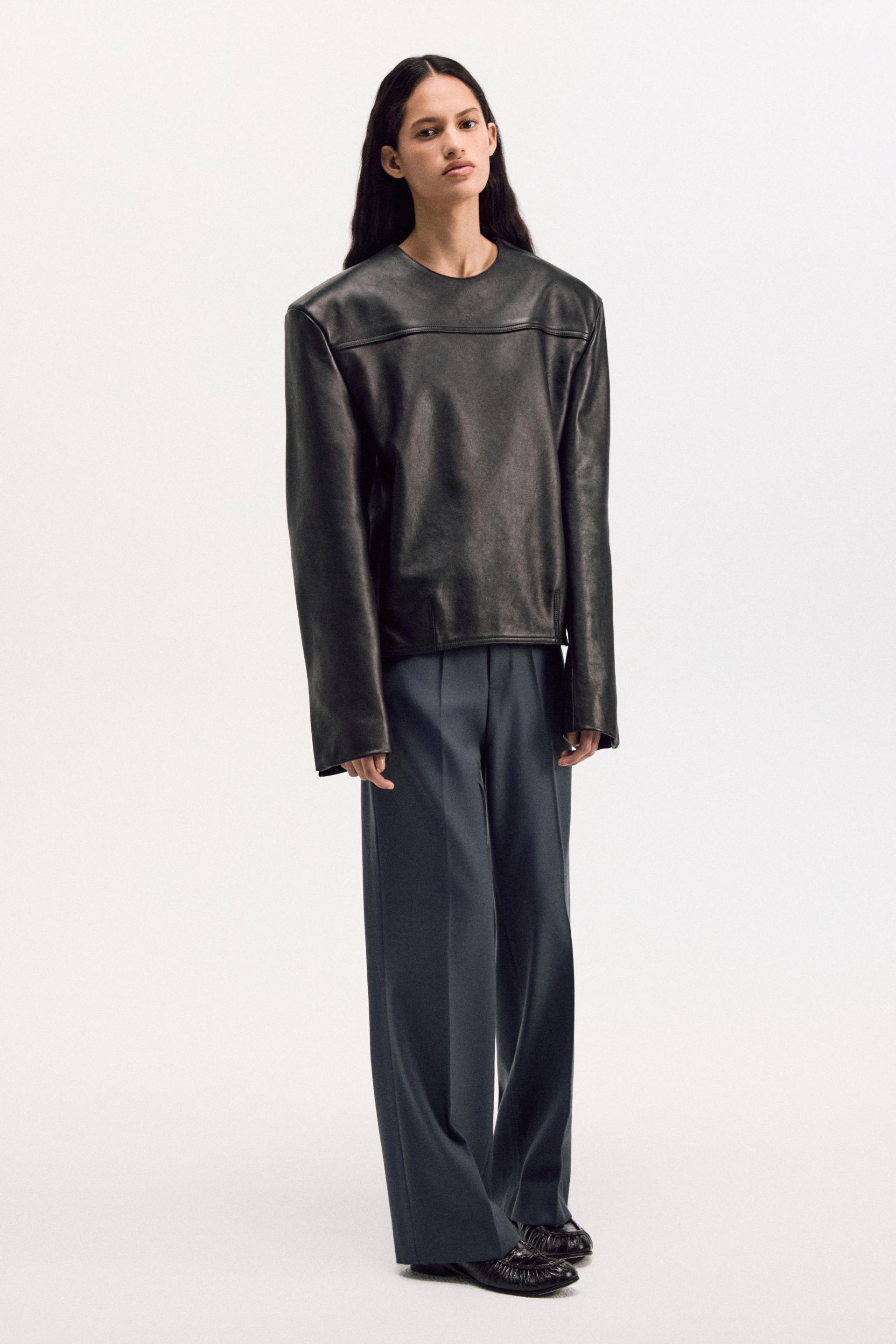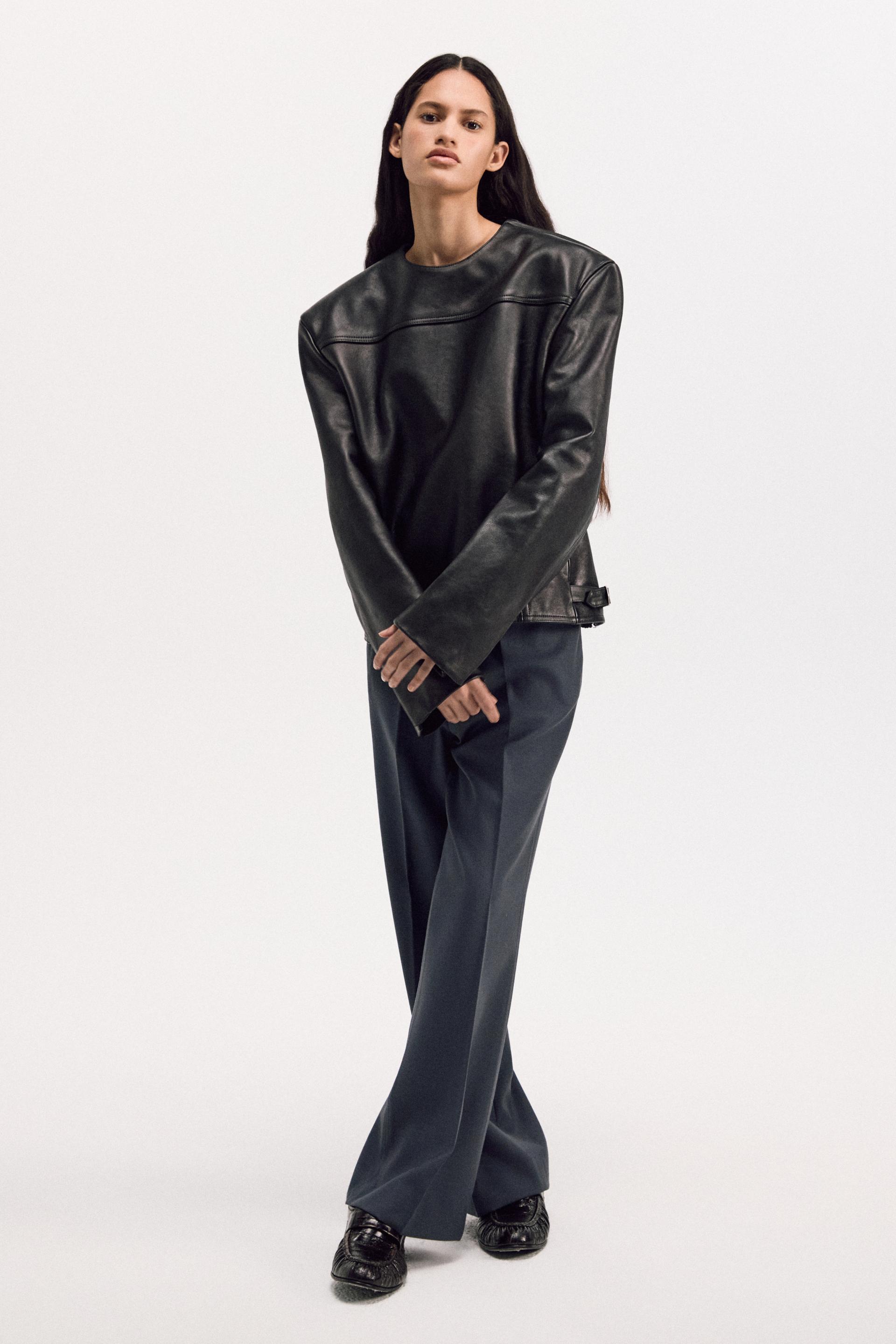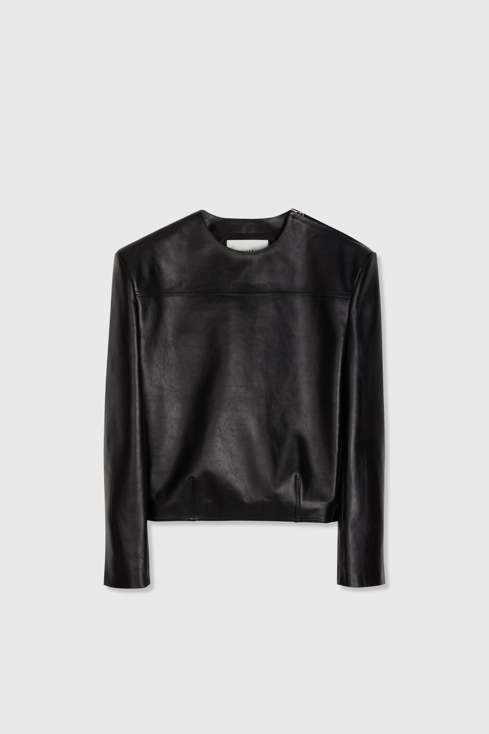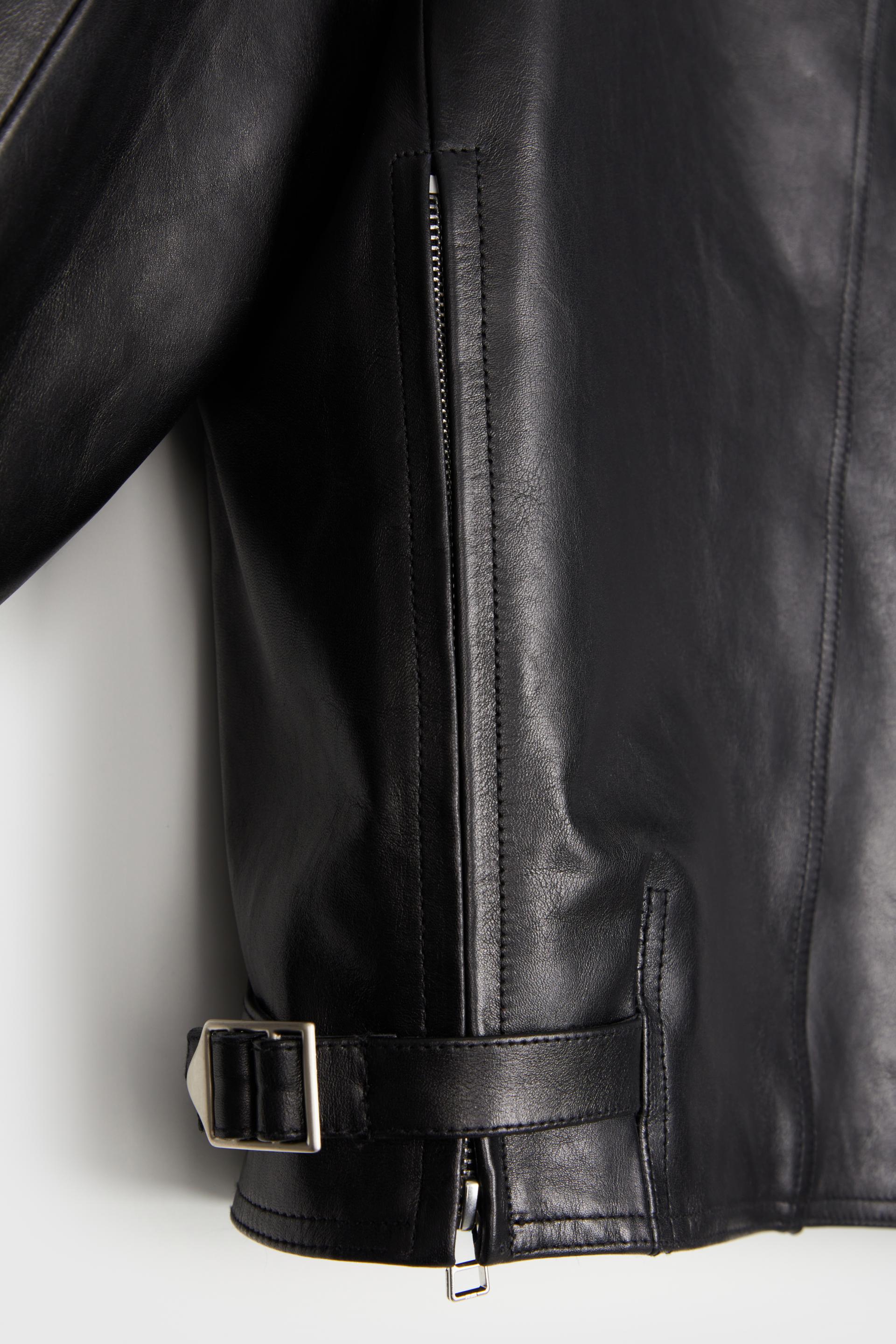 모토 풀오버 레더 재킷은 80년대 모터사이클 수트의 원형을 제한적인 요소로 재해석한 아이템입니다. 자연스러운 광택의 드럼 다잉 카우하이드 소재가 깊이감있는 컬러와 견고한 균형의 실루엣을 형성합니다. 강조된 박스숄더 실루엣과 세트인 슬리브, 어깨와 측면 지퍼 클로즈로 착용하는 풀오버 포맷이며 후면의 스티칭 핸들과 어드저스트가 구성되어 있습니다.