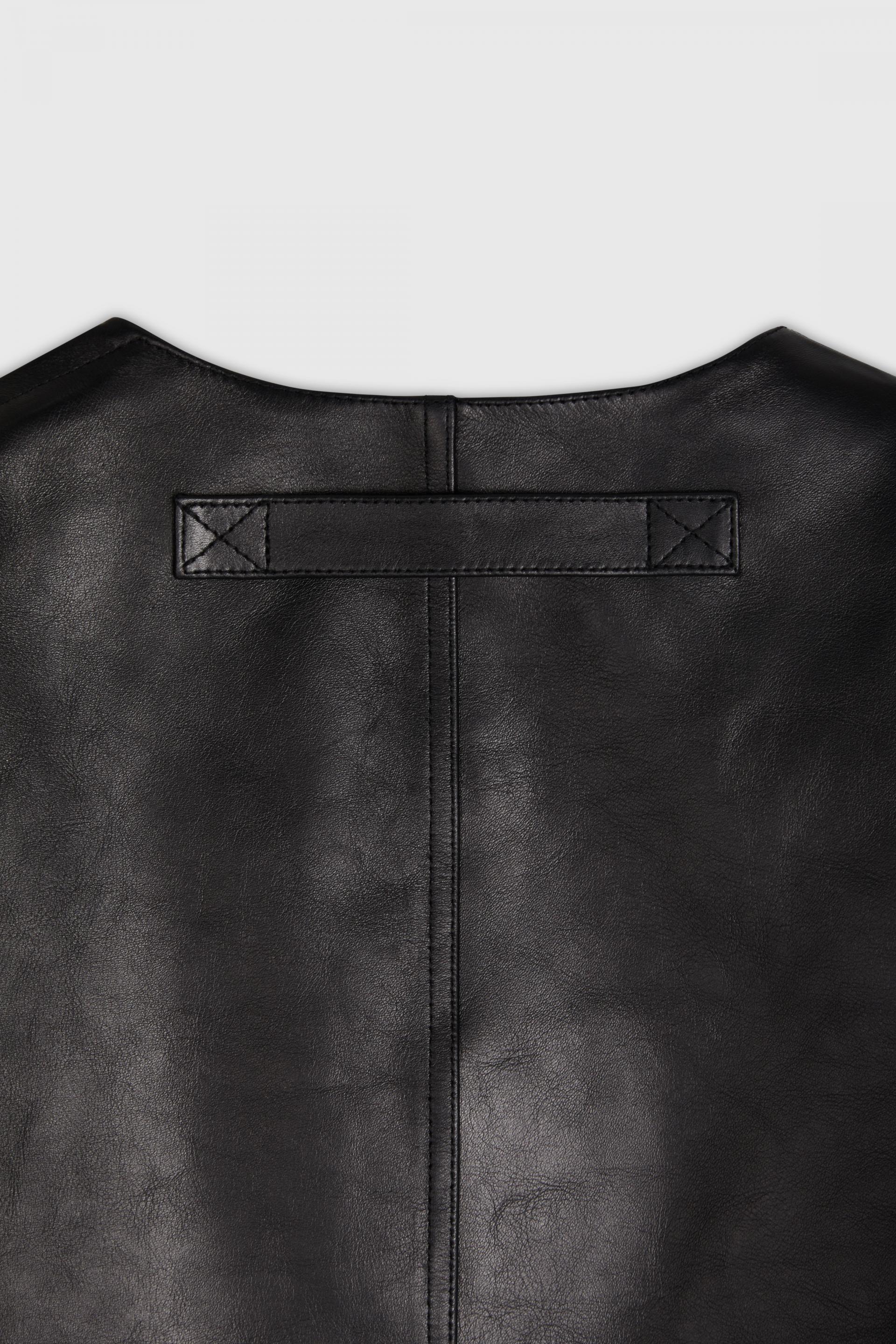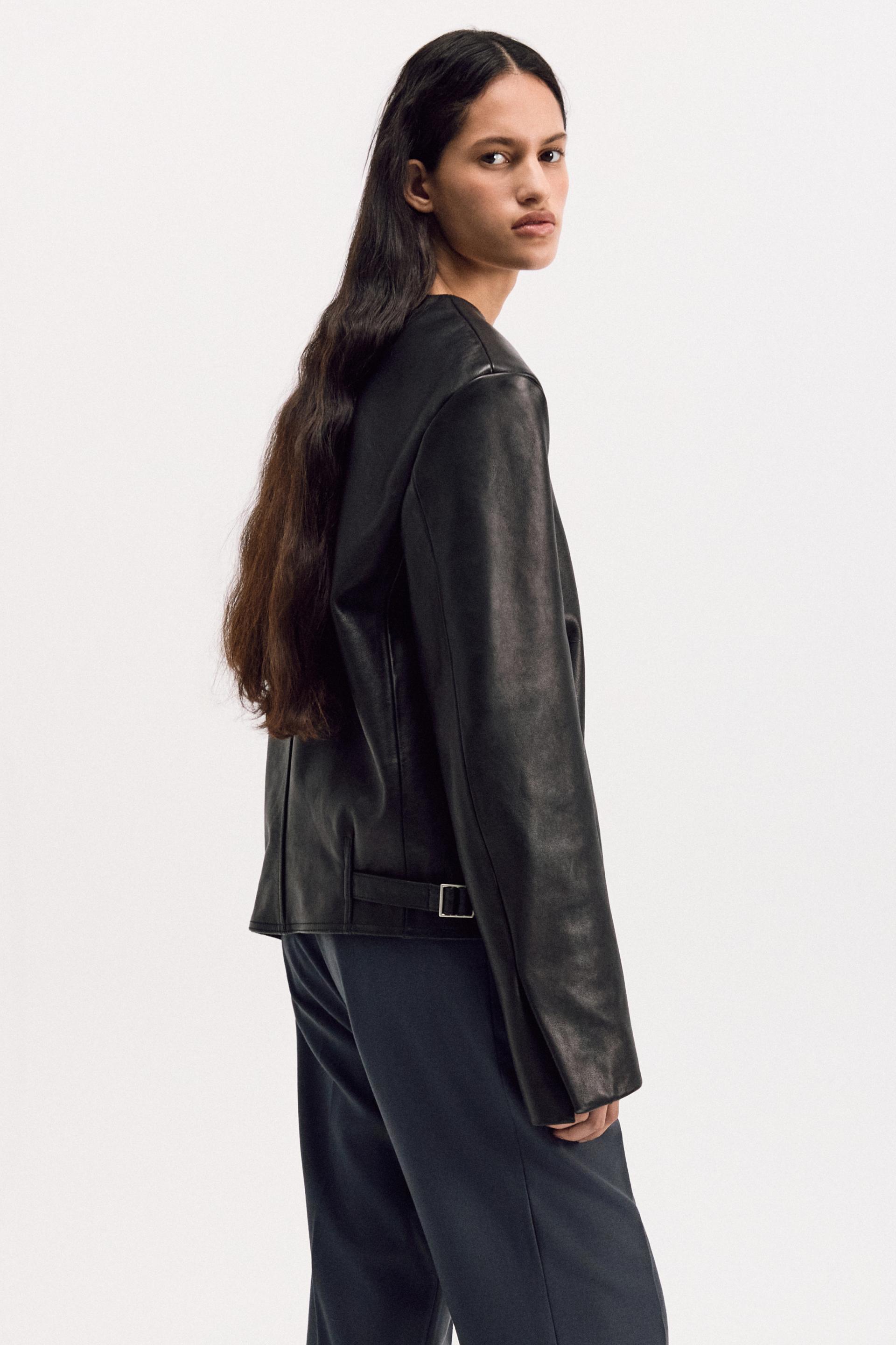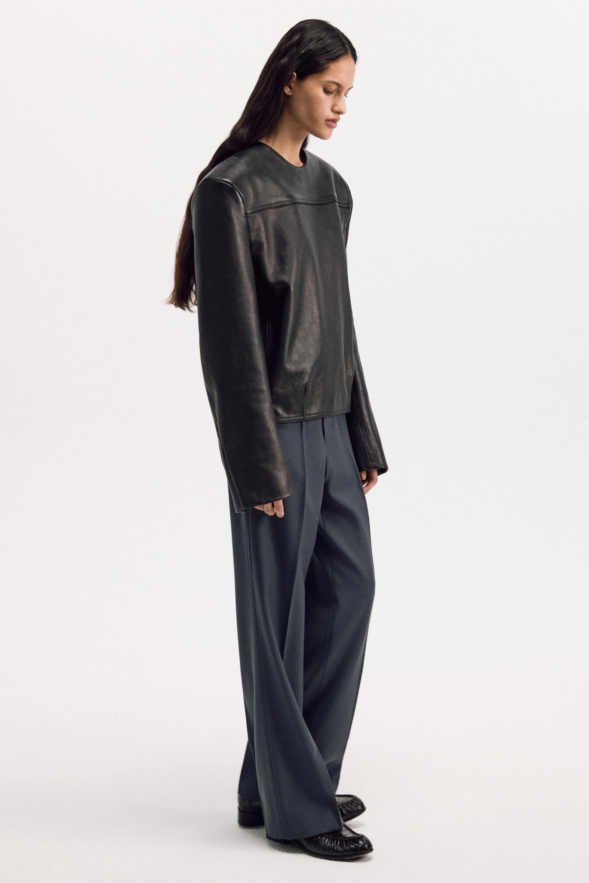 모토 풀오버 레더 재킷은 80년대 모터사이클 수트의 원형을 제한적인 요소로 재해석한 아이템입니다. 자연스러운 광택의 드럼 다잉 카우하이드 소재가 깊이감있는 컬러와 견고한 균형의 실루엣을 형성합니다. 강조된 박스숄더 실루엣과 세트인 슬리브, 어깨와 측면 지퍼 클로즈로 착용하는 풀오버 포맷이며 후면의 스티칭 핸들과 어드저스트가 구성되어 있습니다.