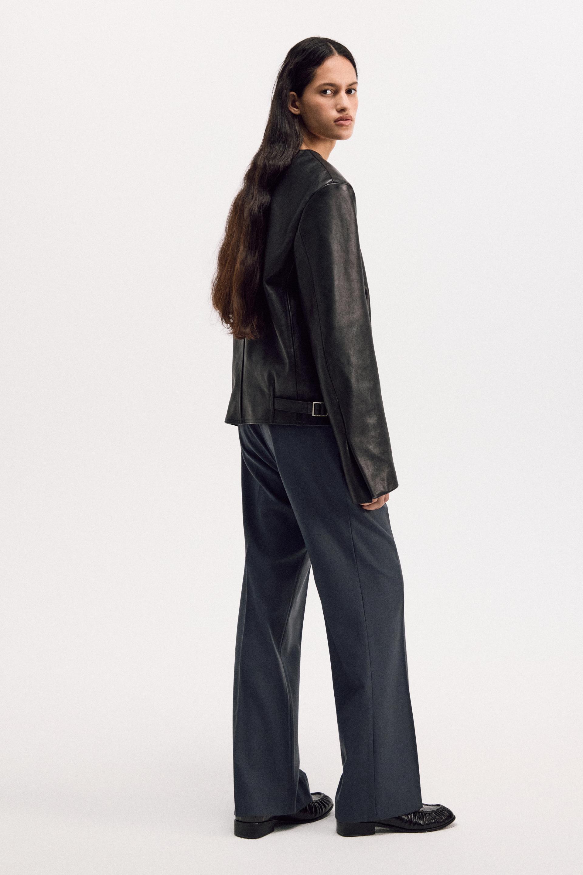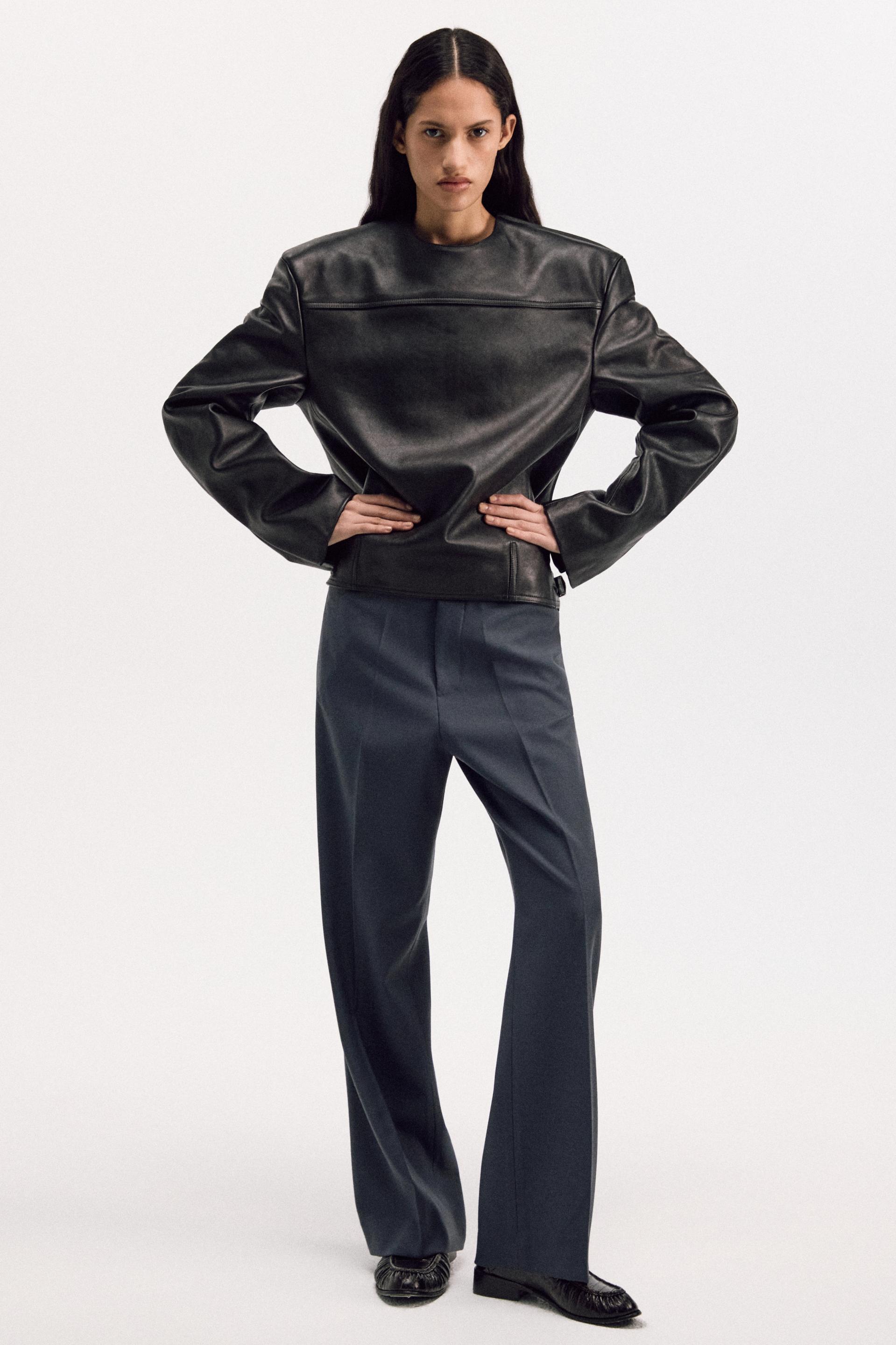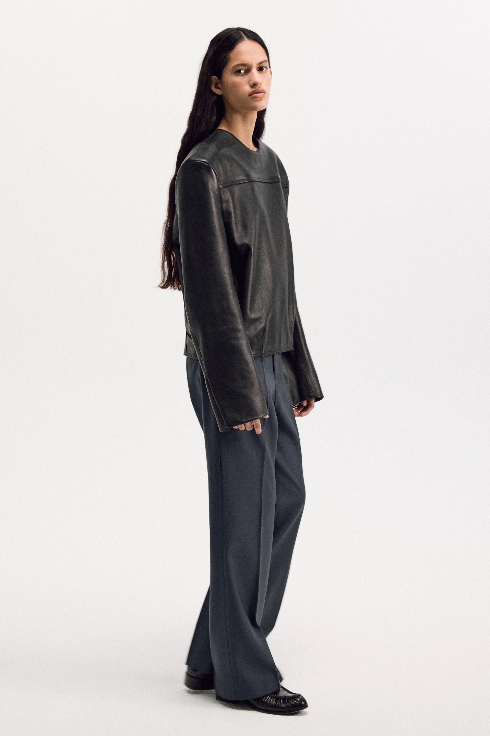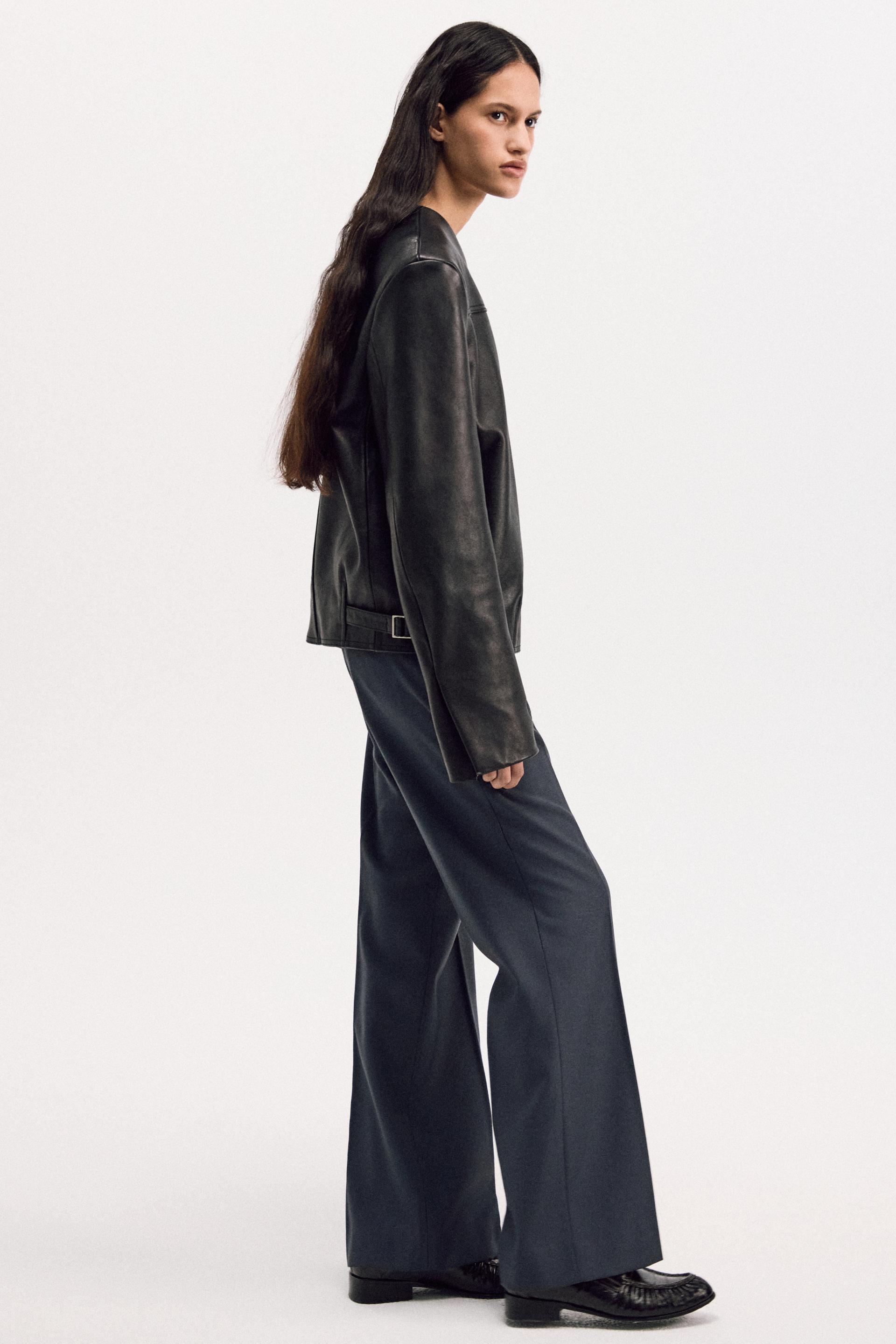 모토 풀오버 레더 재킷은 80년대 모터사이클 수트의 원형을 제한적인 요소로 재해석한 아이템입니다. 자연스러운 광택의 드럼 다잉 카우하이드 소재가 깊이감있는 컬러와 견고한 균형의 실루엣을 형성합니다. 강조된 박스숄더 실루엣과 세트인 슬리브, 어깨와 측면 지퍼 클로즈로 착용하는 풀오버 포맷이며 후면의 스티칭 핸들과 어드저스트가 구성되어 있습니다.