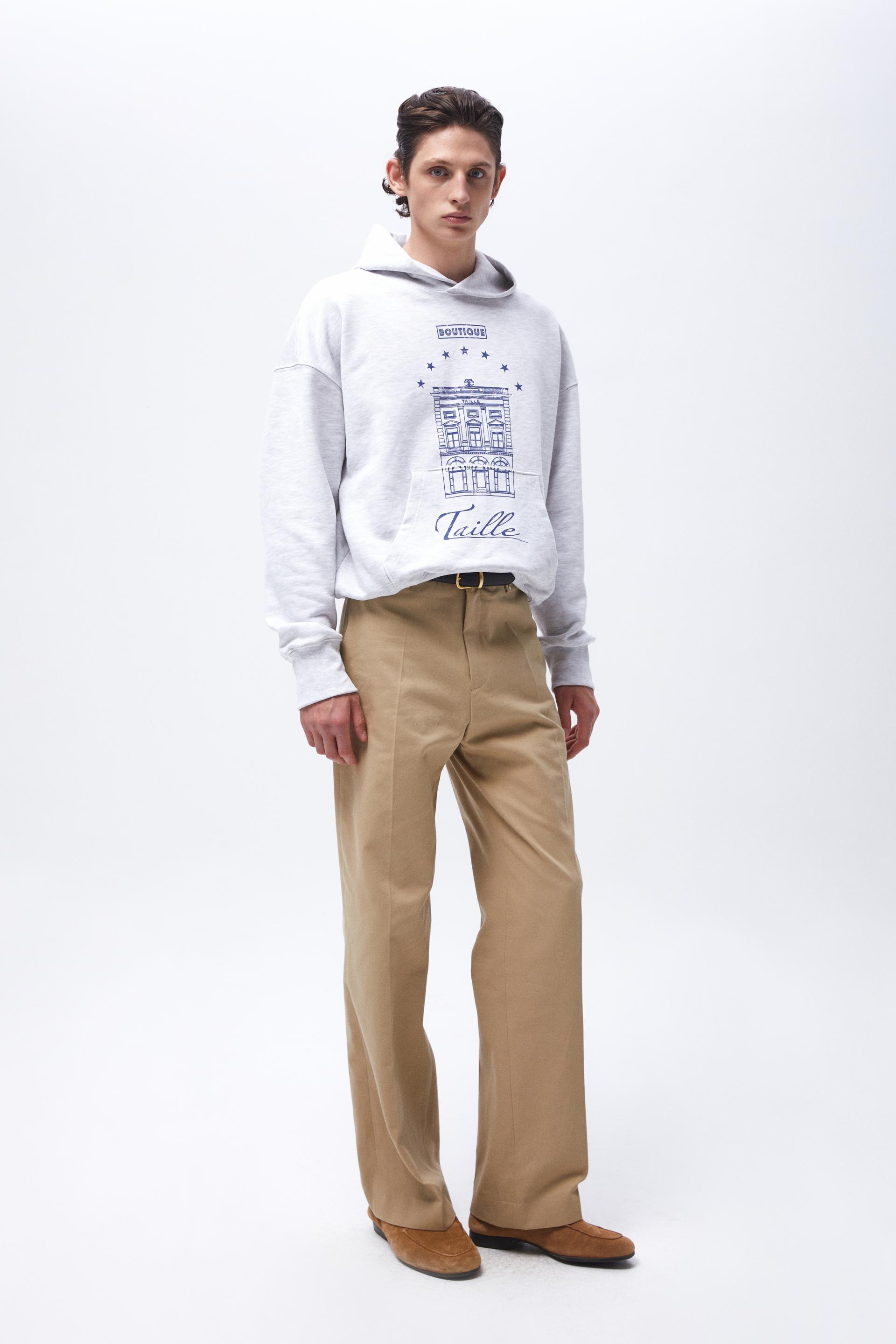 타일레 시그니처 에센셜 컬렉션 로고 후디입니다. 750g 프렌치 테리 코튼을 사용, 엔자임(Enzyme) 가공과 유연가공을 거쳐 늘어짐이 적으며 정갈하고 매끄러운 표면이 특징입니다. 드롭 숄더에 오버사이즈 실루엣, 길지 않은 기장감이며 가슴 중앙 부티크 로고가 프린트 되었습니다. 소매와 밑단 등 내구성을 요하는 부분은 바텍을 더했습니다.