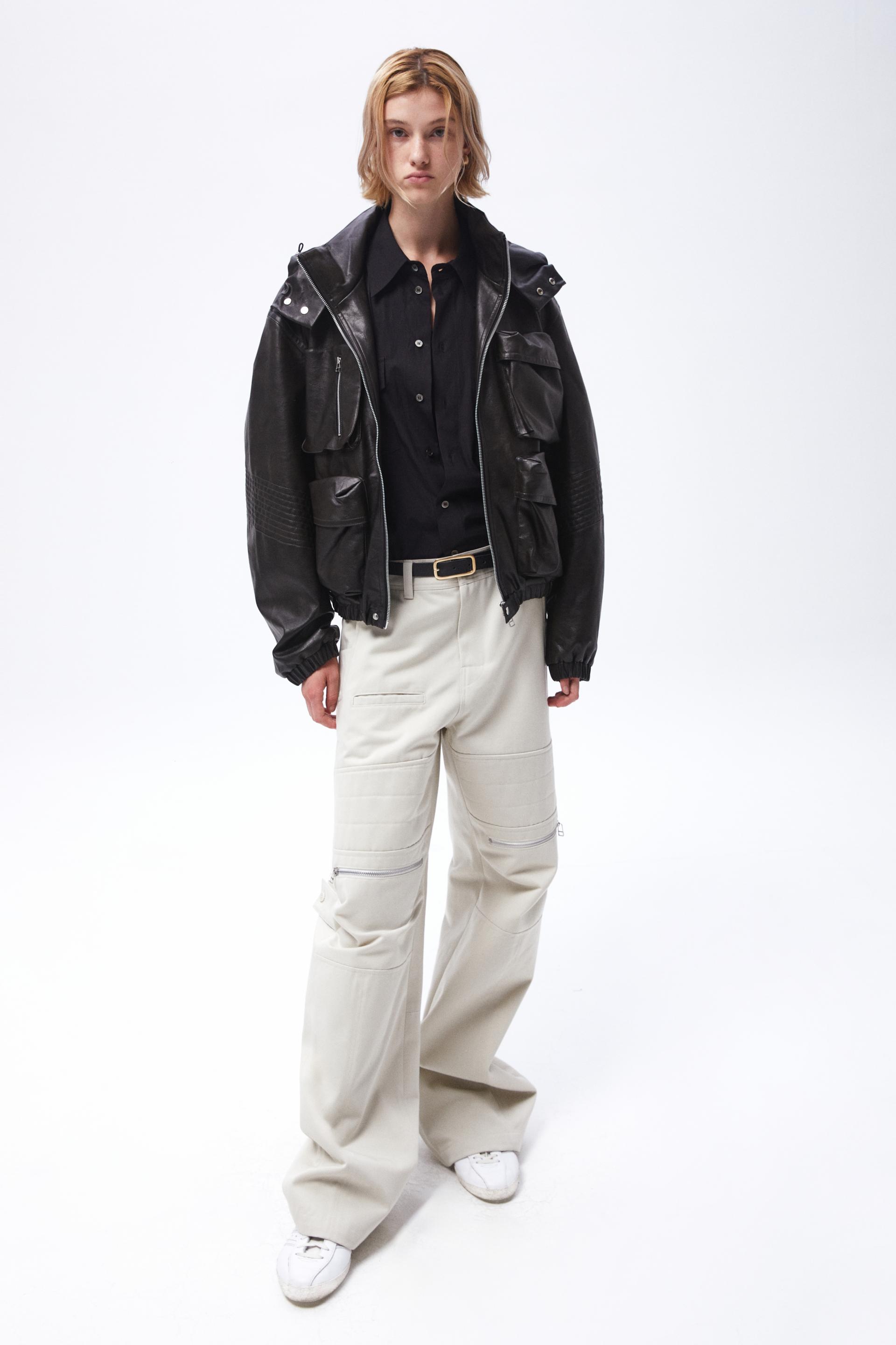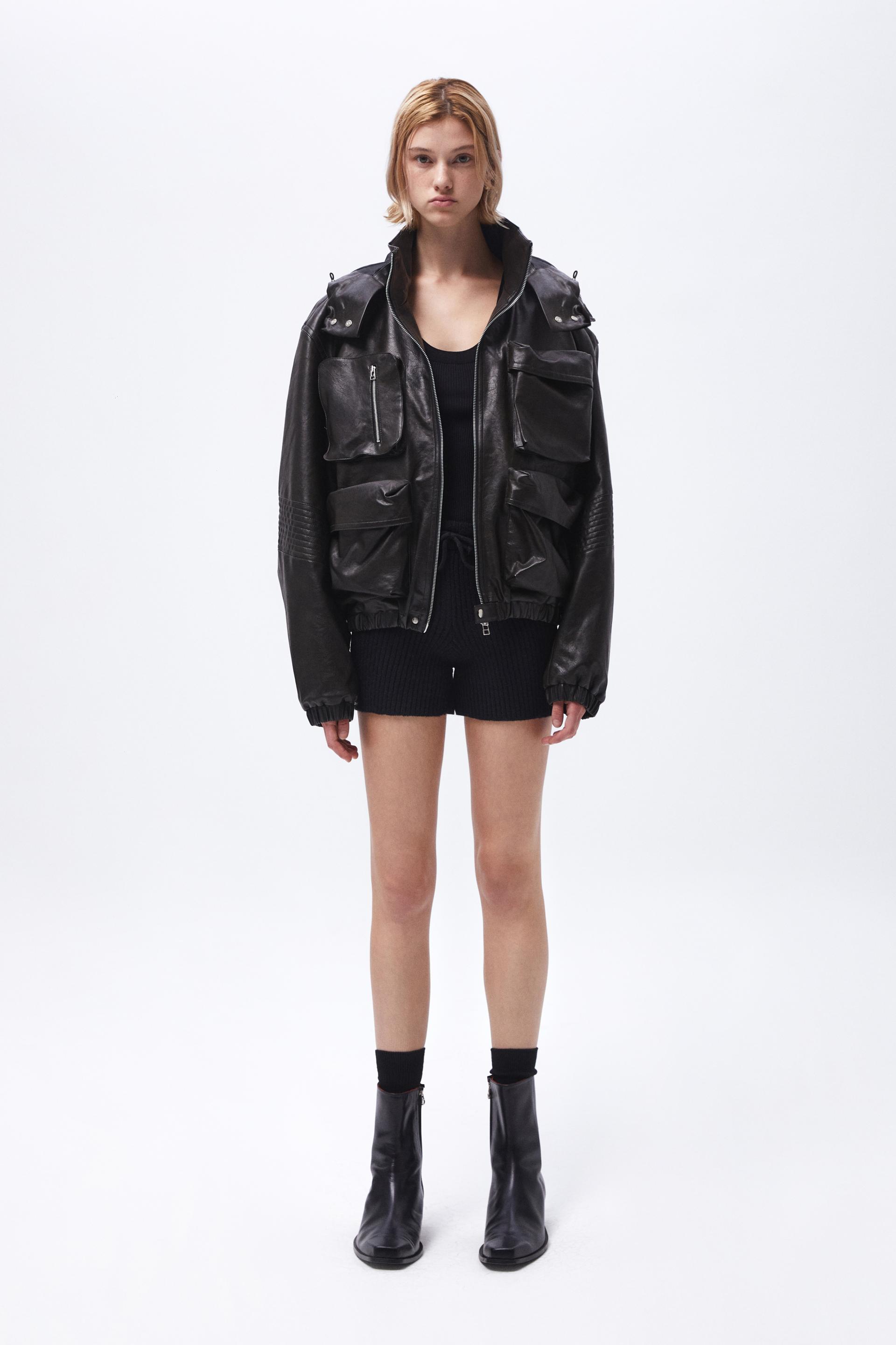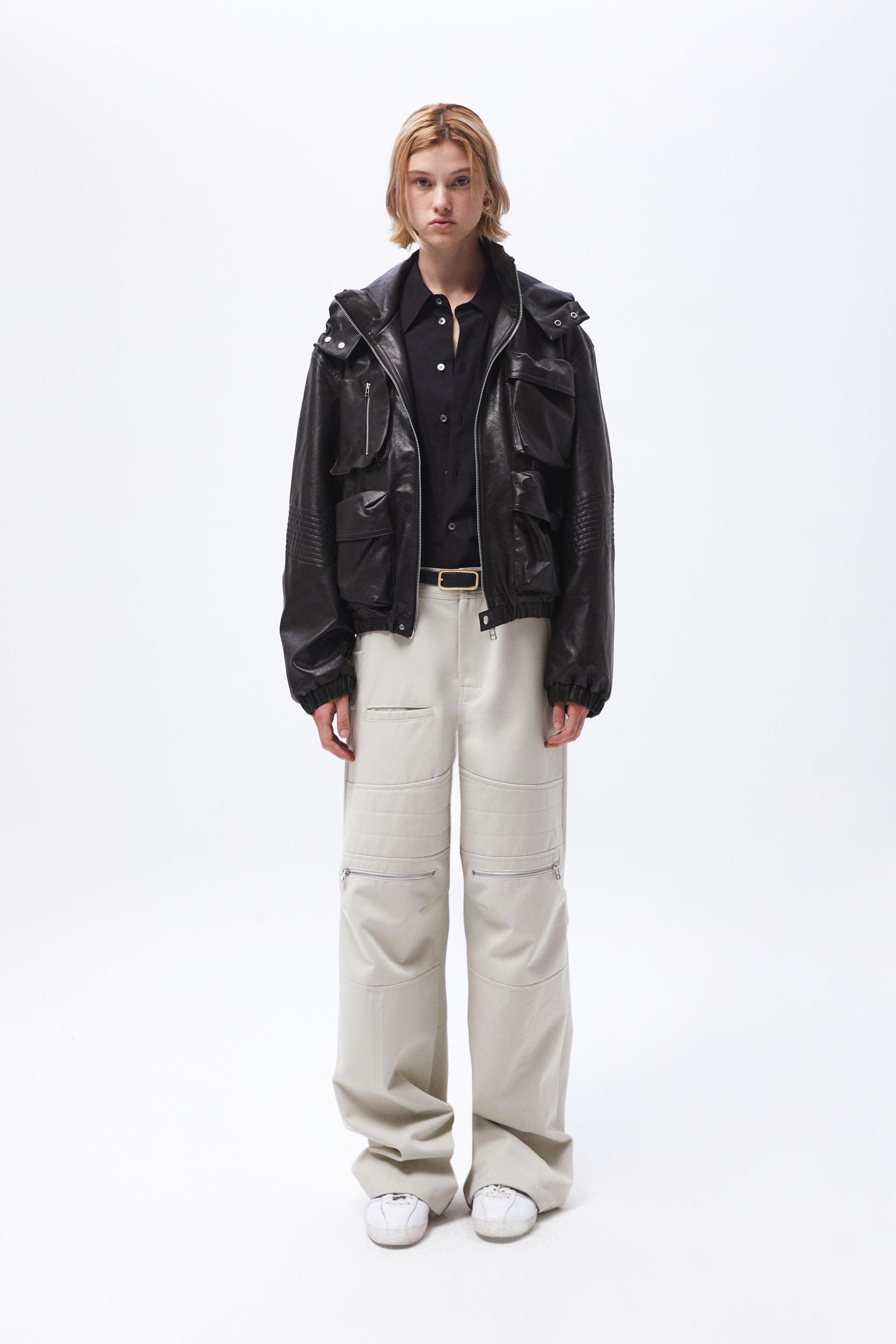 스포티하면서 정돈된 분위기의 테크니컬 블루종 입니다. 8-90년대 유틸리티 피싱 베스트를 제한적인 요소로 재해석한 디자인입니다. 전면부 3개의 볼륨 테크니컬 포켓과 지퍼포켓이 있고 스냅 버튼으로 탈착이 가능한 입체 후드, 퀼팅 스티치가 더해진 슬리브가 특징적입니다. 따뜻한 톤과 광택을 가진 블랙 Faux leather는 아이코닉하고 감각적인 룩을 완성시킵니다. 불륨 실루엣에 크롭한 기장감이며 YKK®사의 2way 지퍼 및 스냅버튼을 사용했습니다.