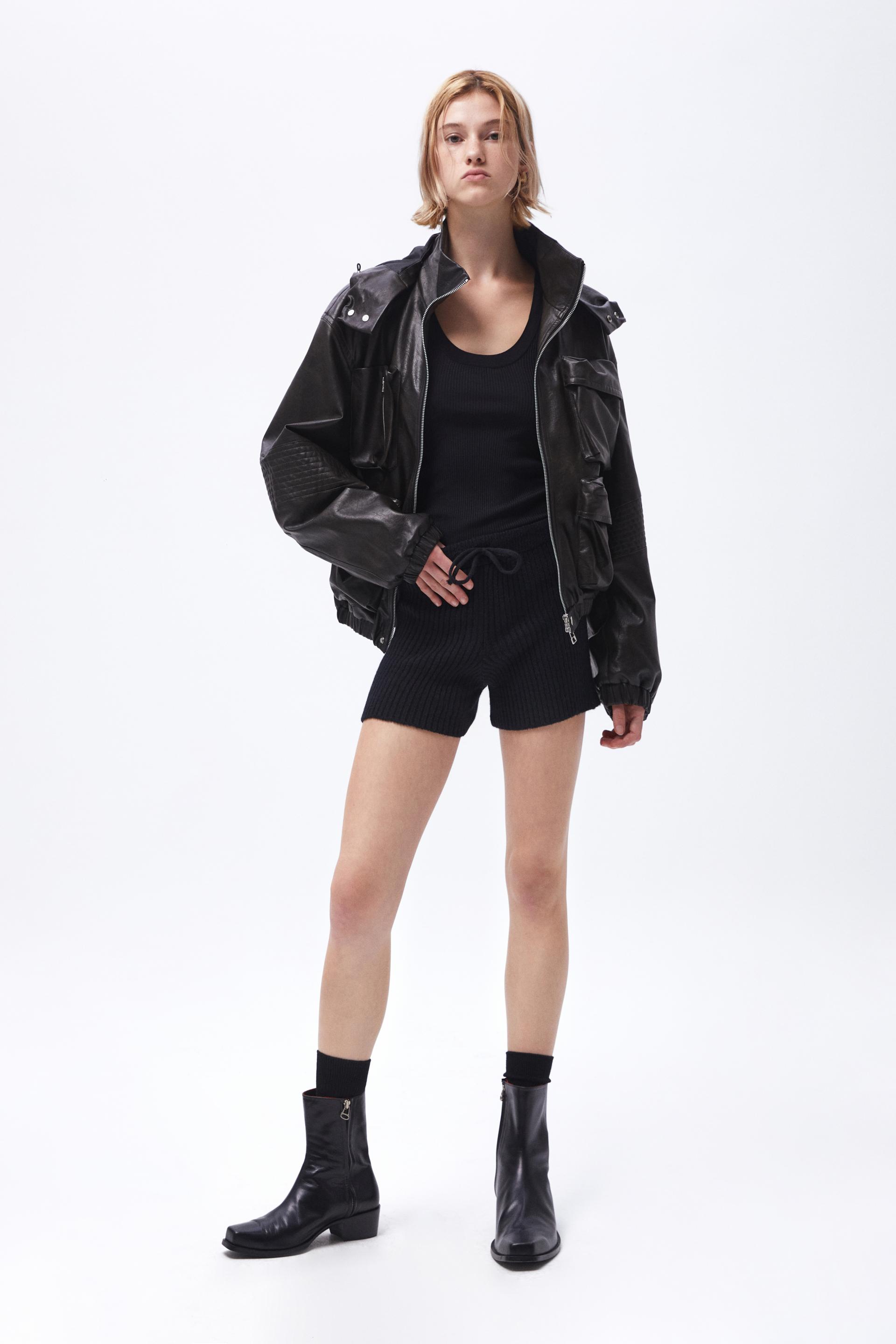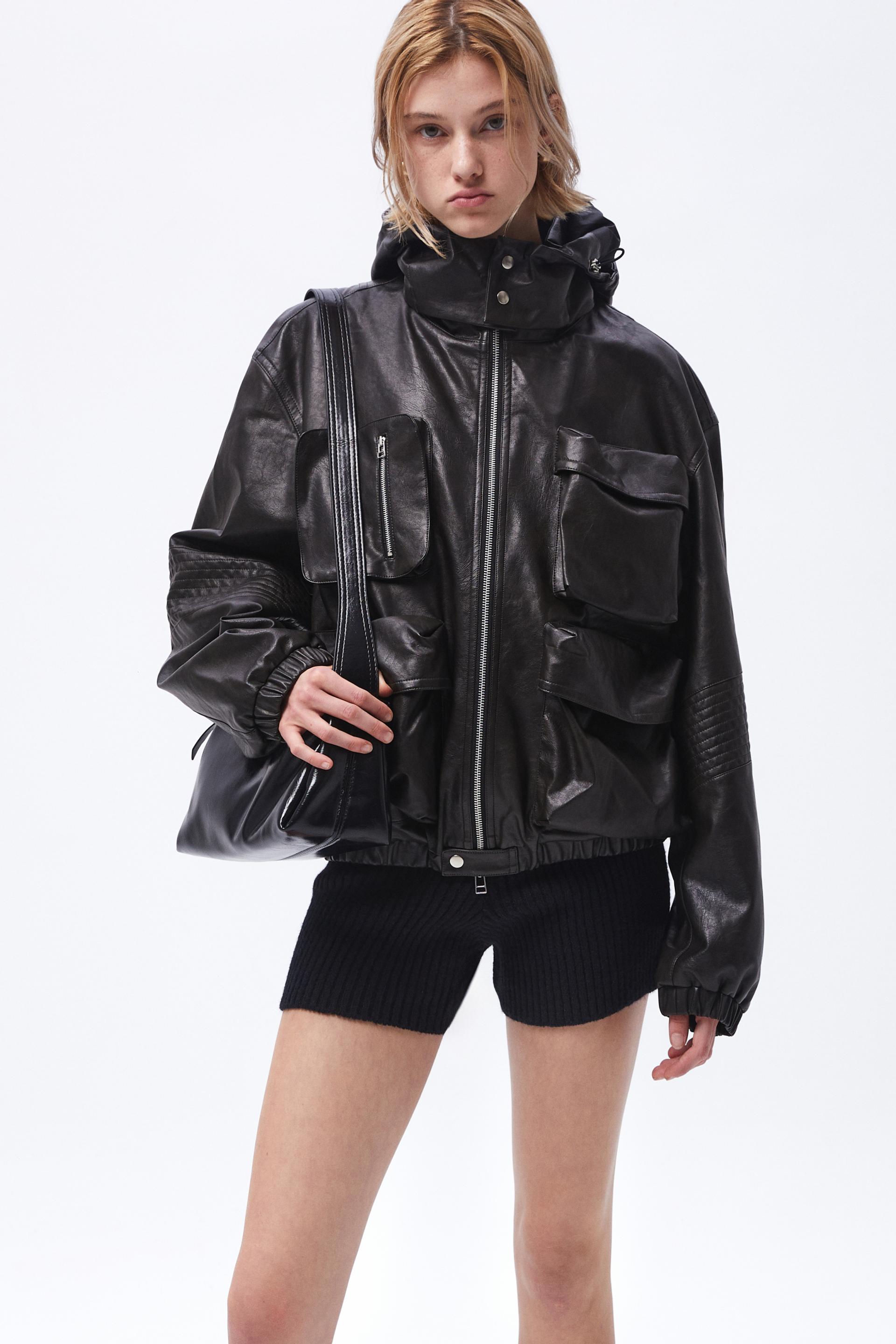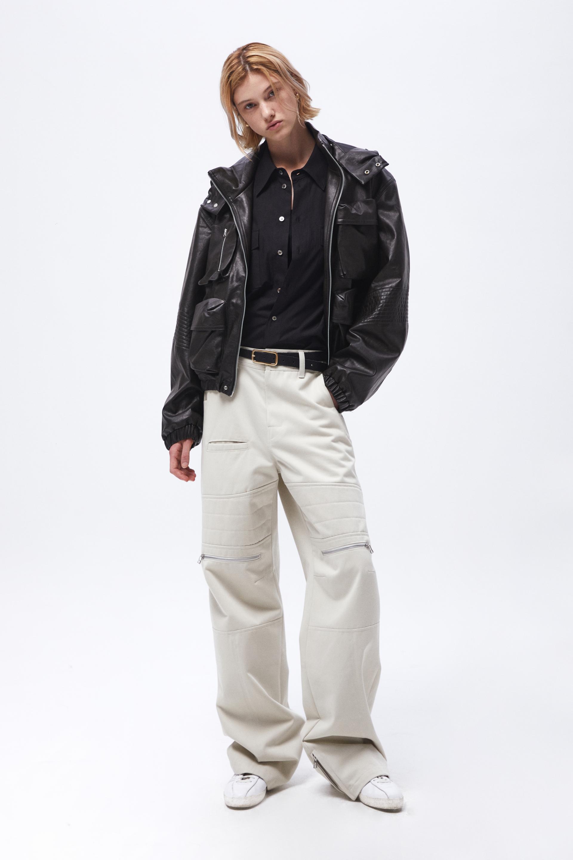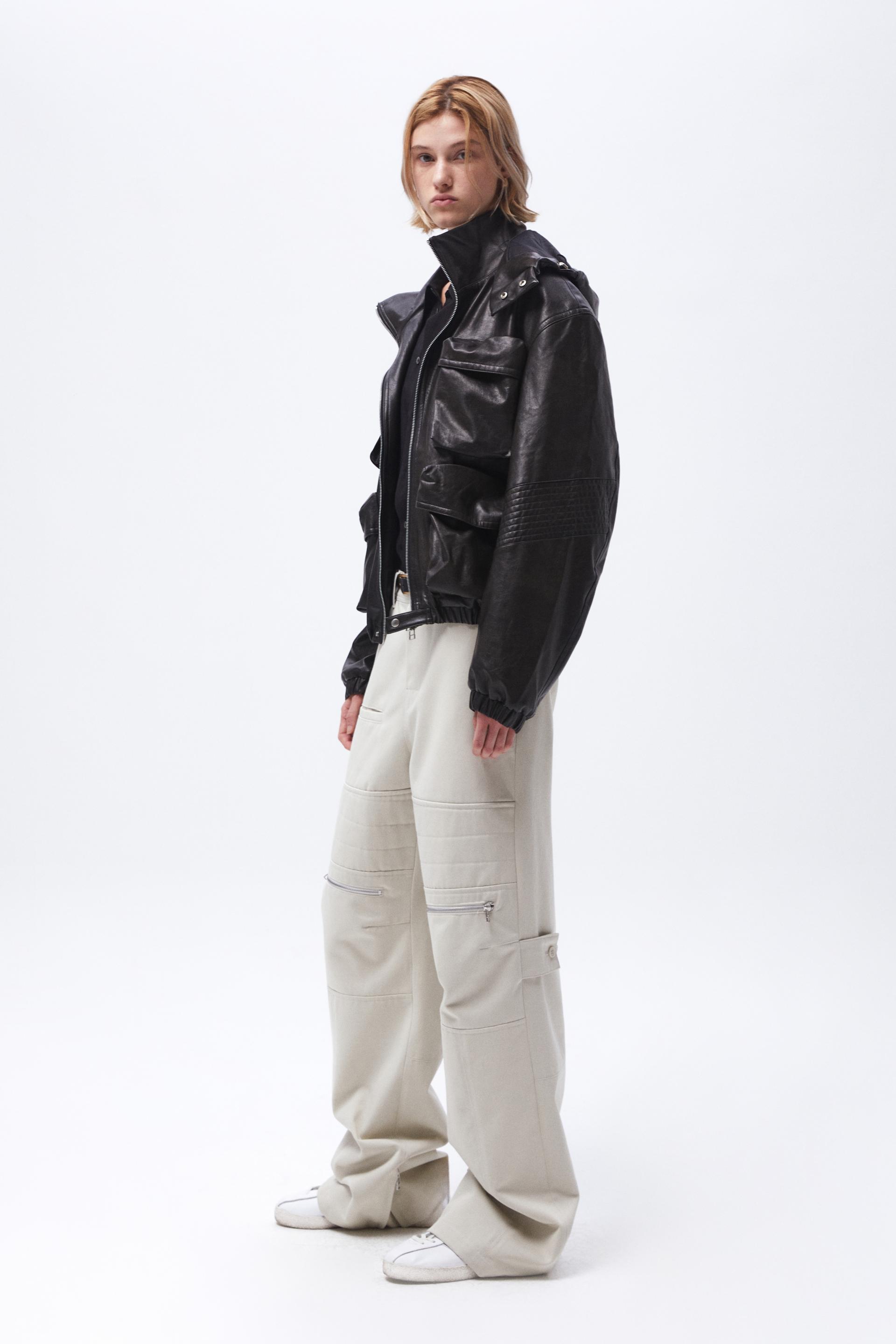 스포티하면서 정돈된 분위기의 테크니컬 블루종 입니다. 8-90년대 유틸리티 피싱 베스트를 제한적인 요소로 재해석한 디자인입니다. 전면부 3개의 볼륨 테크니컬 포켓과 지퍼포켓이 있고 스냅 버튼으로 탈착이 가능한 입체 후드, 퀼팅 스티치가 더해진 슬리브가 특징적입니다. 따뜻한 톤과 광택을 가진 블랙 Faux leather는 아이코닉하고 감각적인 룩을 완성시킵니다. 불륨 실루엣에 크롭한 기장감이며 YKK®사의 2way 지퍼 및 스냅버튼을 사용했습니다.