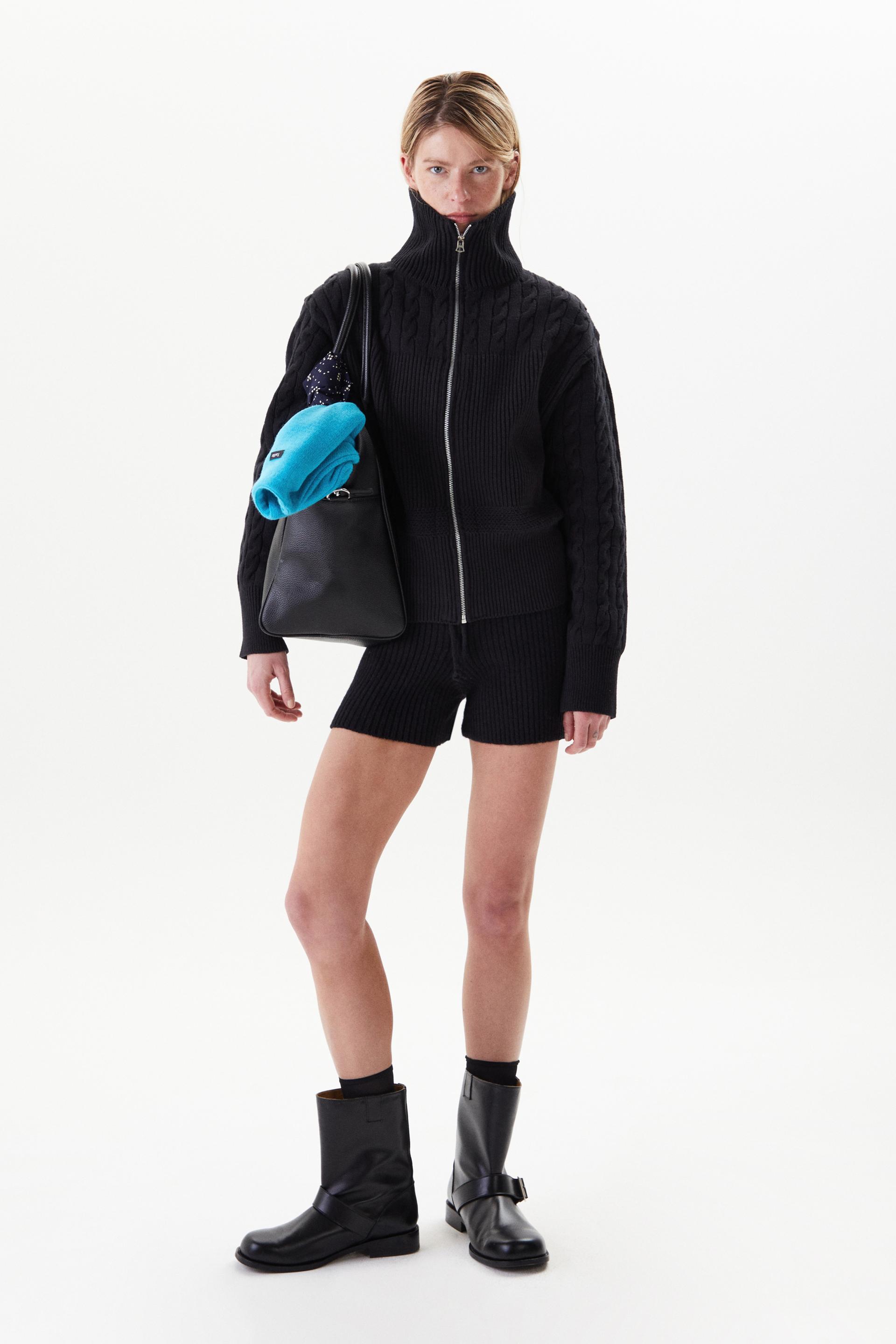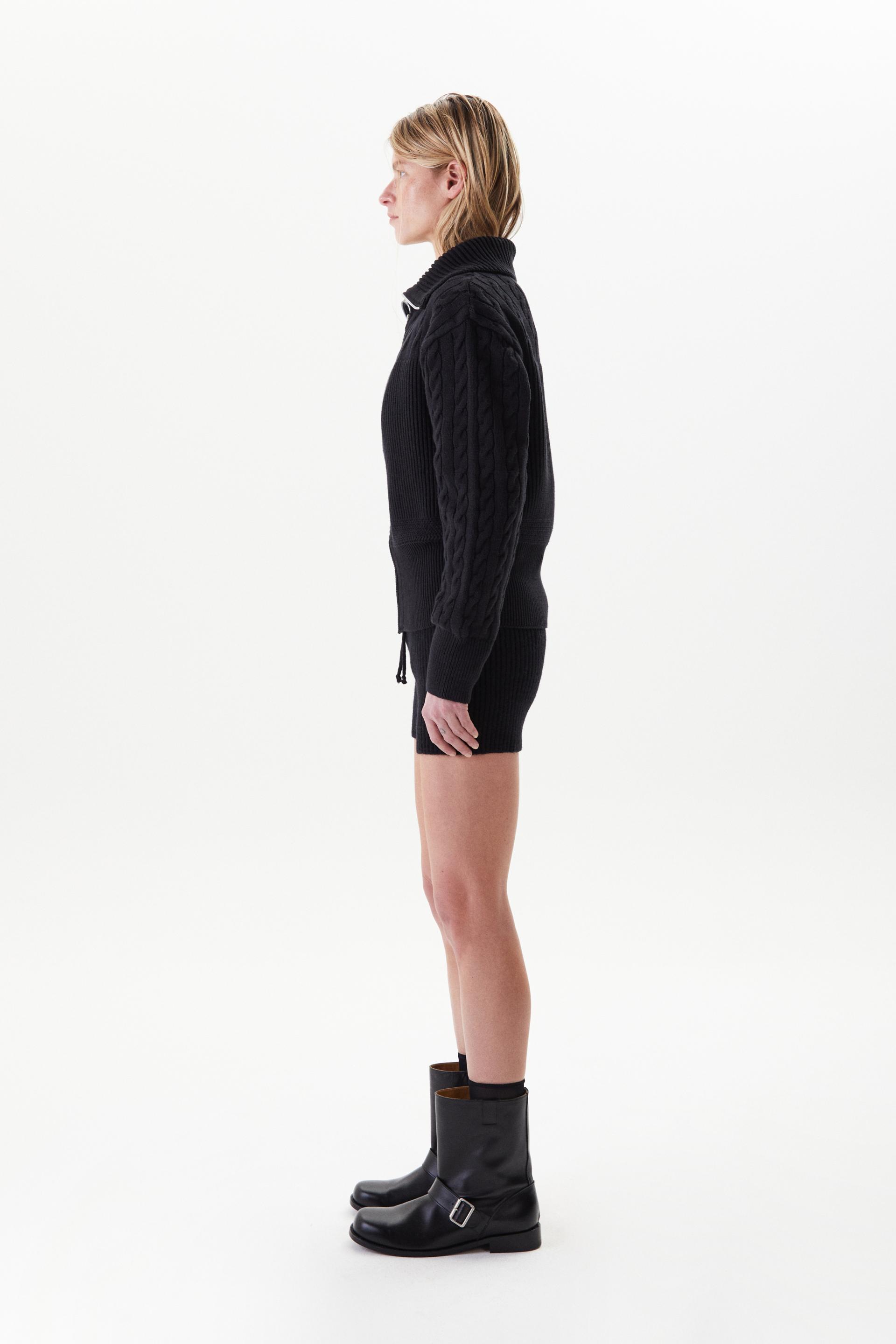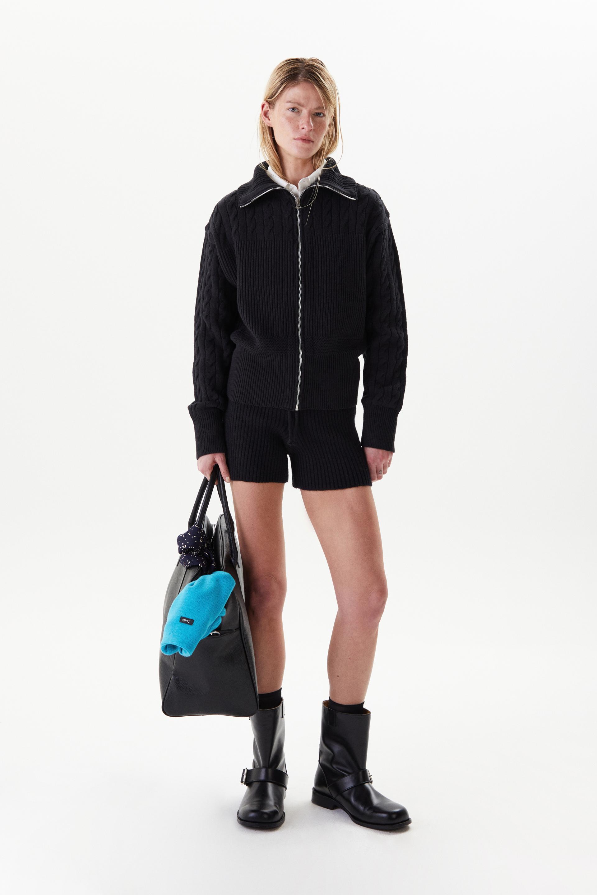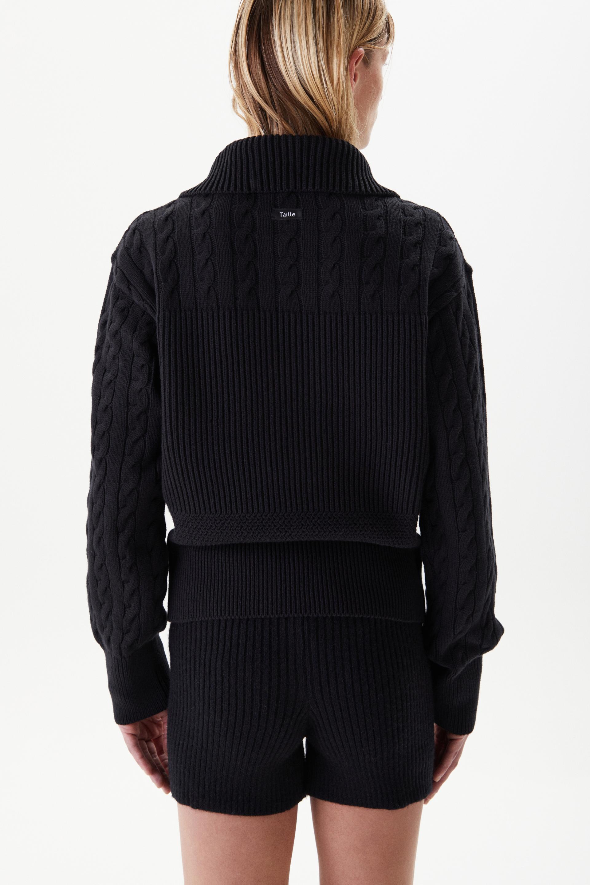 볼륨감이 돋보이는 로우게이지 하이넥 집업 스웨터입니다. 어깨부터 소매까지의 케이블 직조와 가슴 아래로 로열 립 직조를 멀티 편직한 시그니처 디자인으로 아이코닉한 실루엣이 특징입니다. 넓은 폭의 하이넥과 립, 터프한 짜임과 크롭한 기장감은 70년대 해안가 마을을 연상시킵니다. 뒷 목 중심에 타일레 블랙 라벨이 장식되어 있으며 볼드한 슬라이더와 YKK® 금속 지퍼를 사용했습니다.