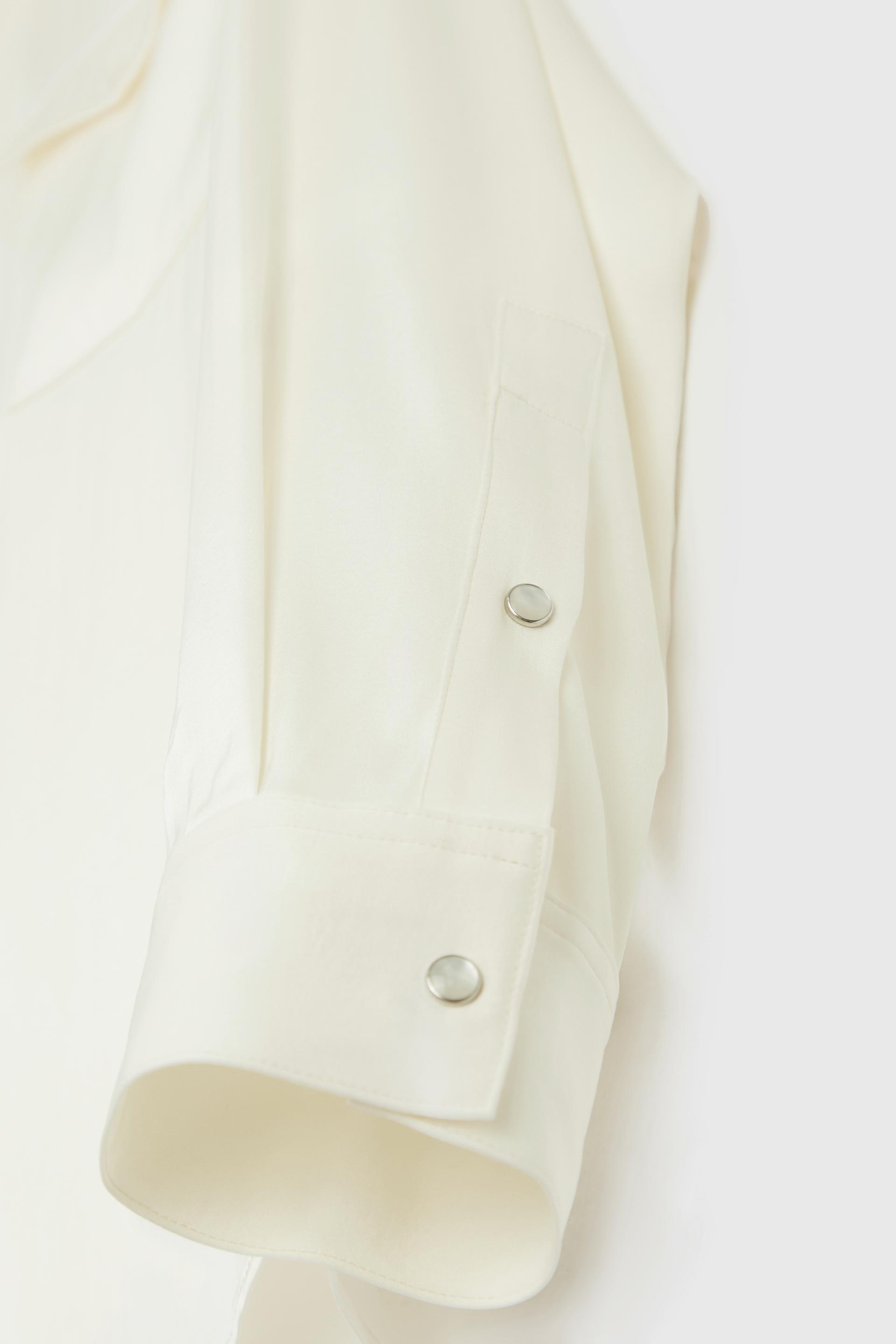 세련된 드레이프가 매력적인 사틴 오피서 셔츠입니다. 90년대 아이콘 클로이 세비니를 연상케하는 자연스럽고 편안하게 흐르는 실루엣과 드레시한 고유의 분위기가 특징입니다. 스탠다드 칼라에 레귤러 핏 타입이며 사용된 단추는 모두 천연 자개단추, 소매단의 여밈은 빈티지 펄 스냅으로 포인트를 더했습니다.