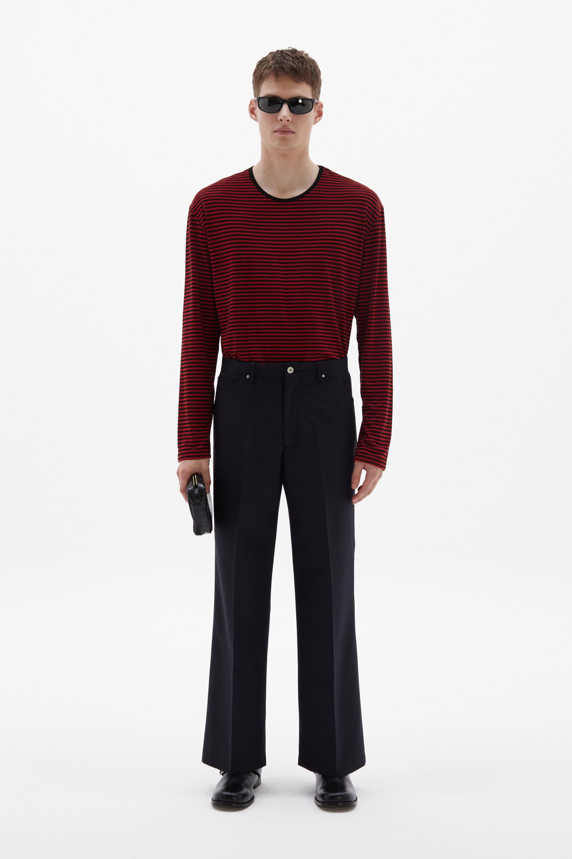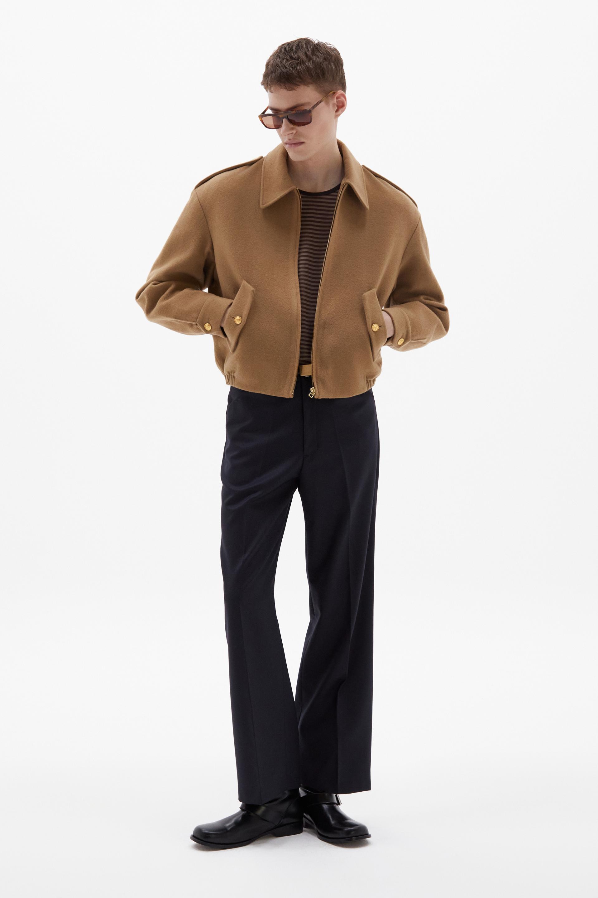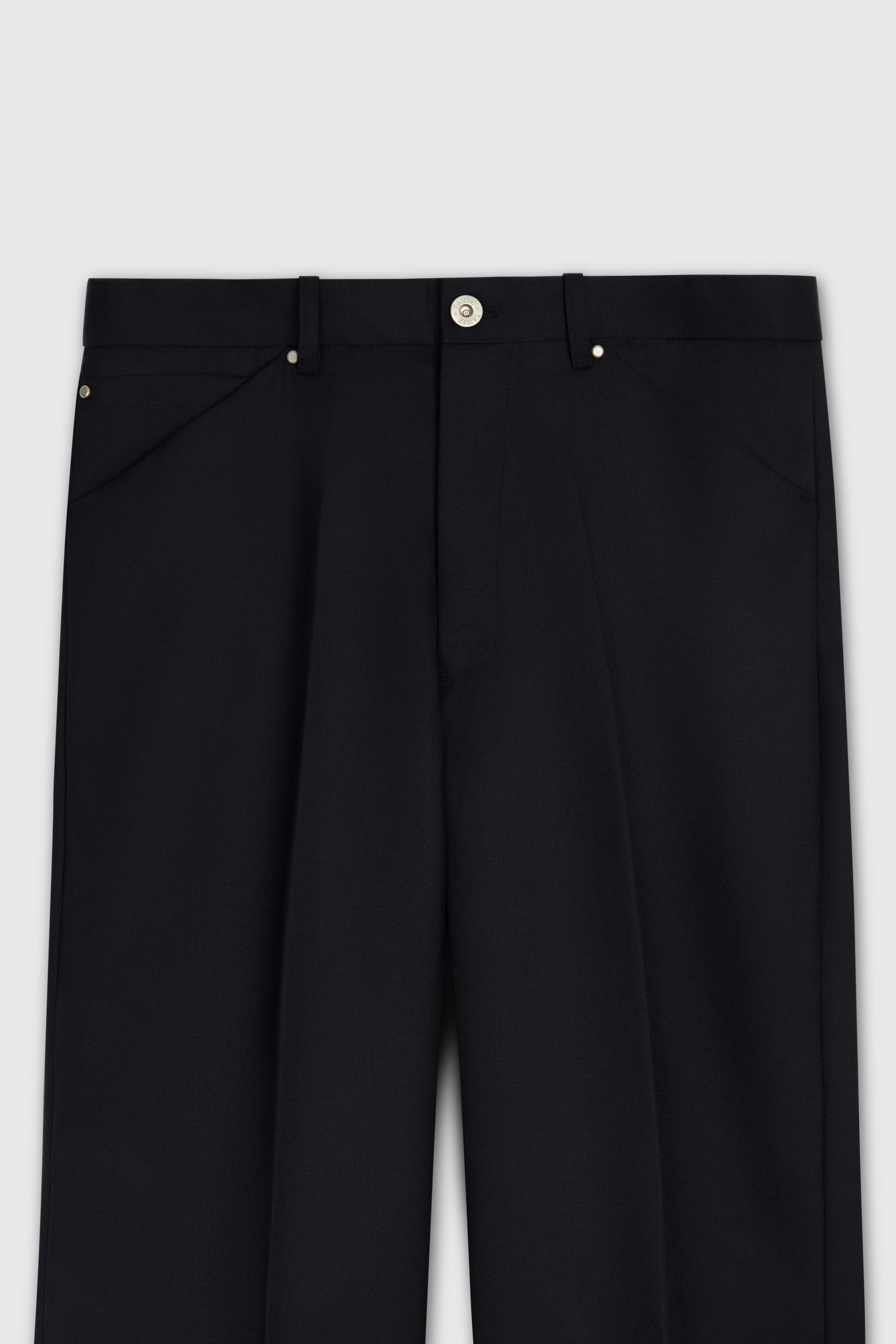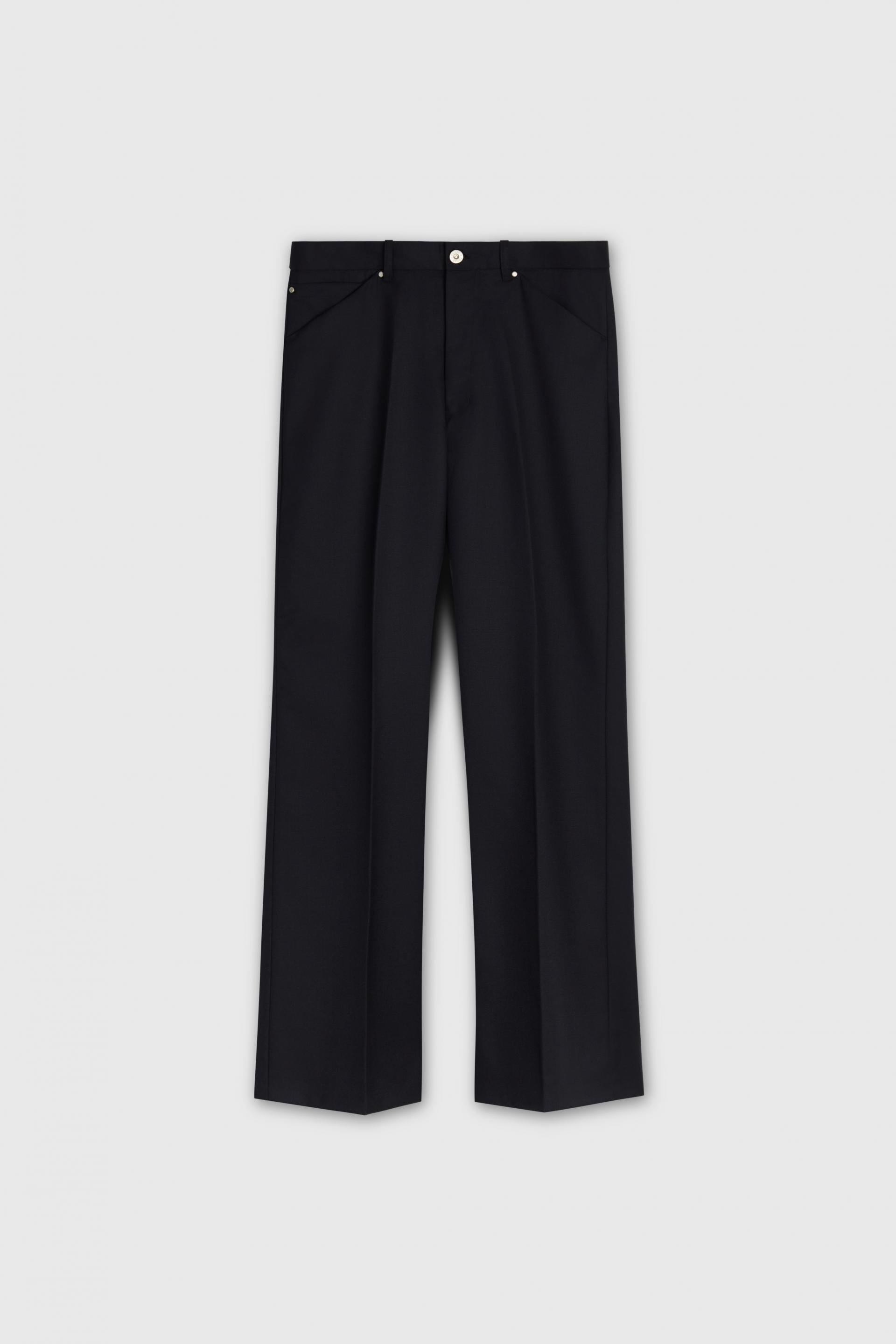 70년대 전반의 판탈론 패션과 시티 팬츠를 현대적으로 재해석한 트라우저 입니다. 탄탄한 밀도의 울 혼방 패브릭은 다리 라인을 따라 슬림하고 간결한 플레어 실루엣을 강조합니다. 콘초 스터드로 마감된 포켓과 벨트라인 타일레 블랙 라벨이 장식되어 있습니다.