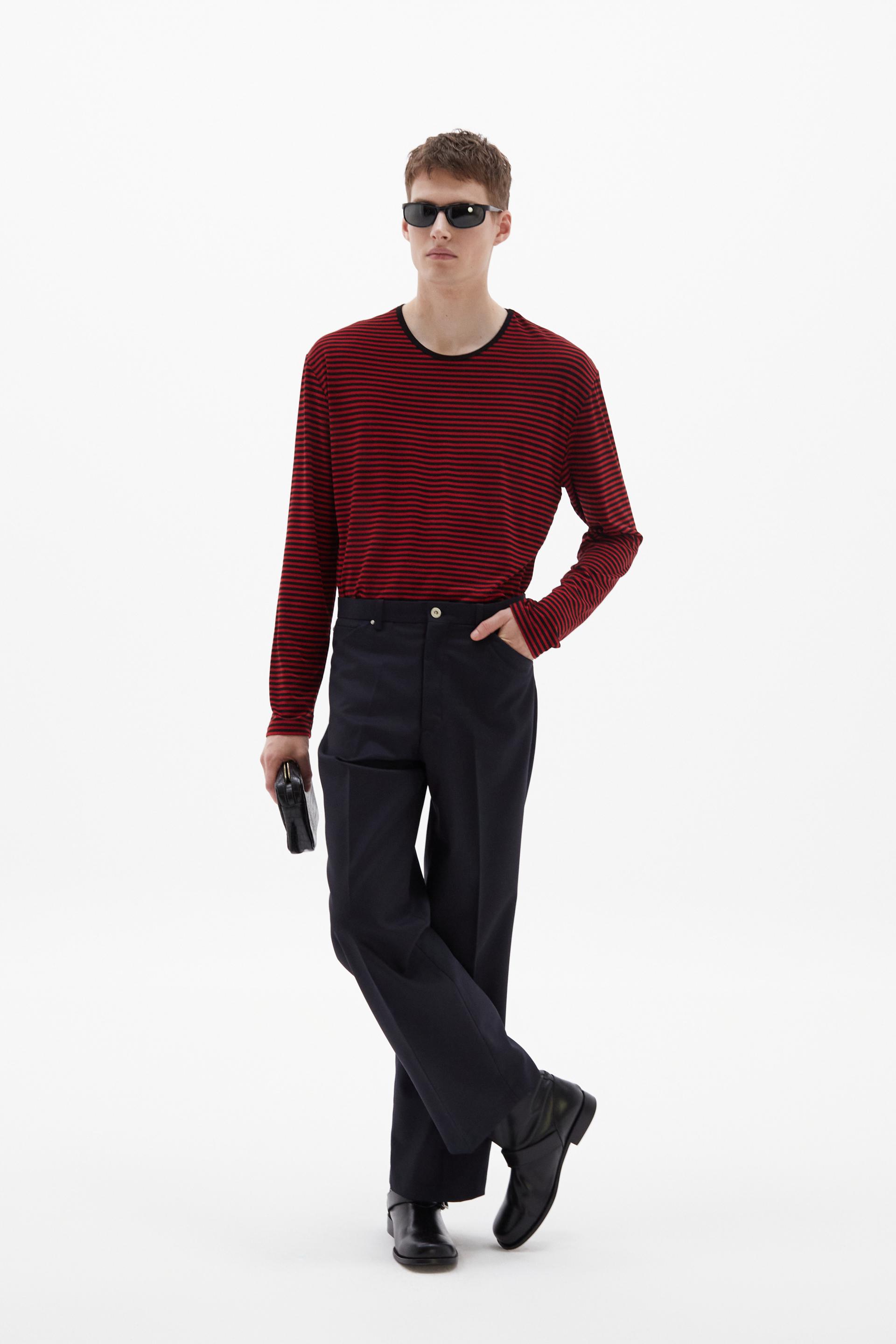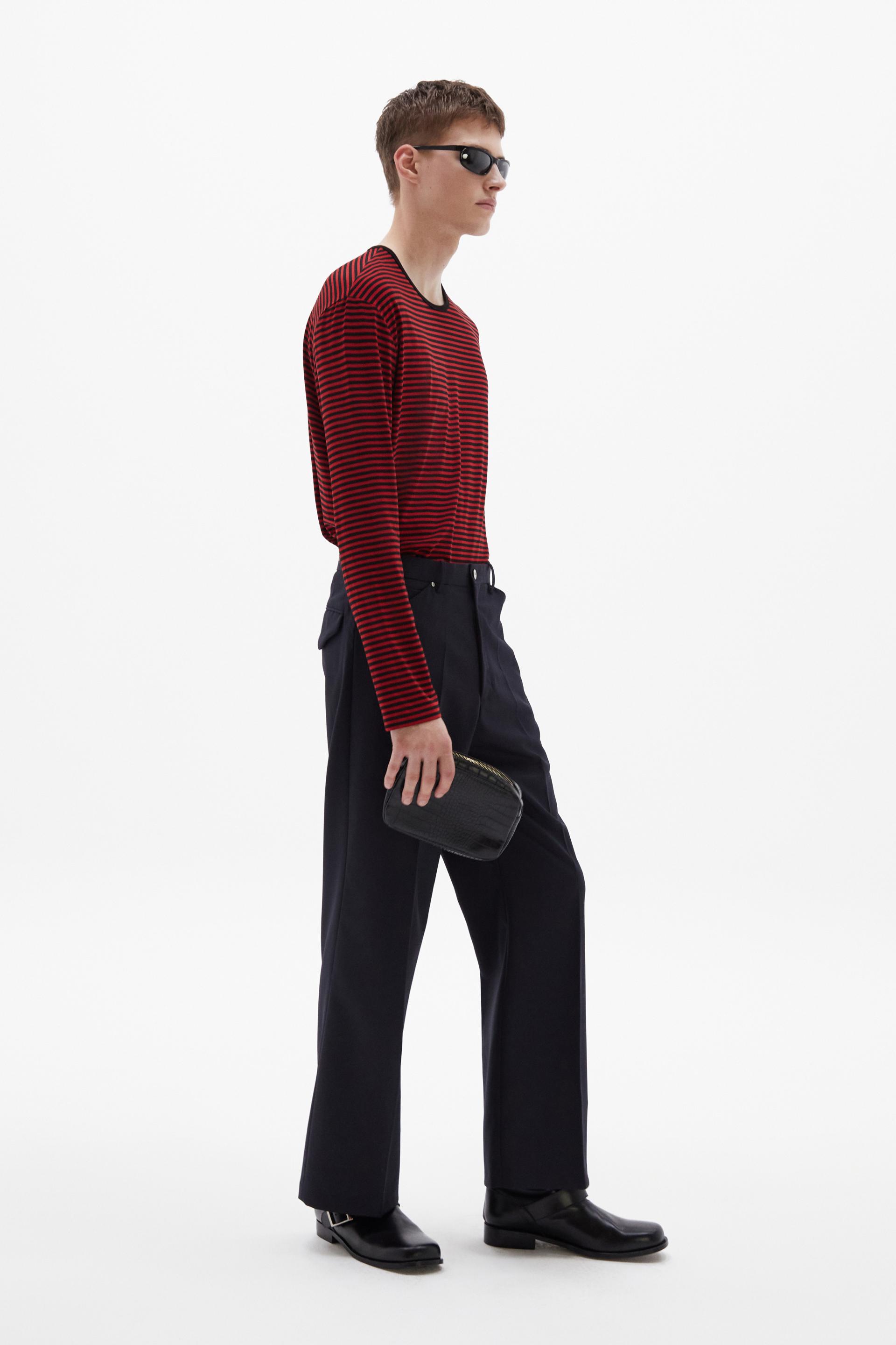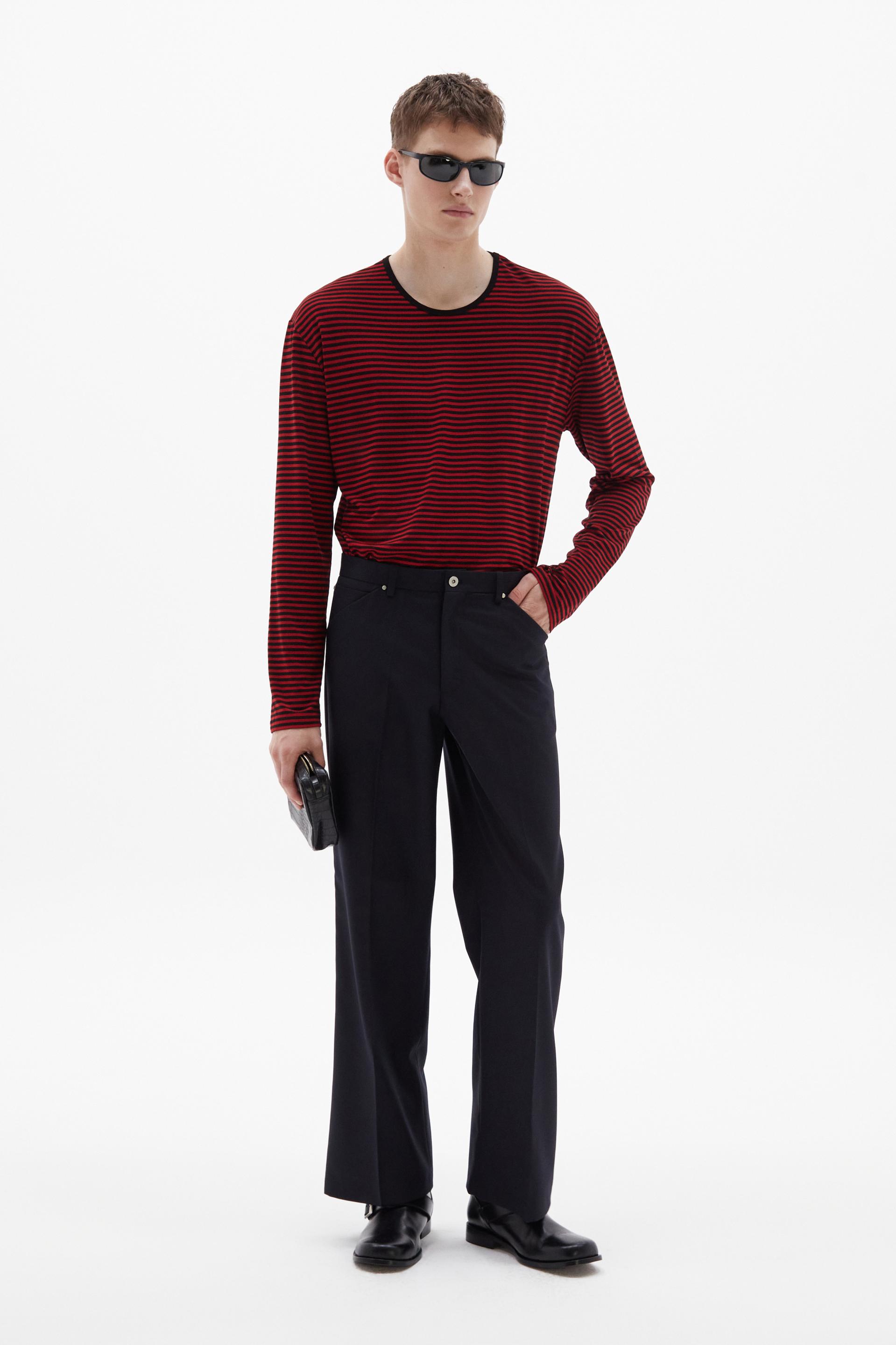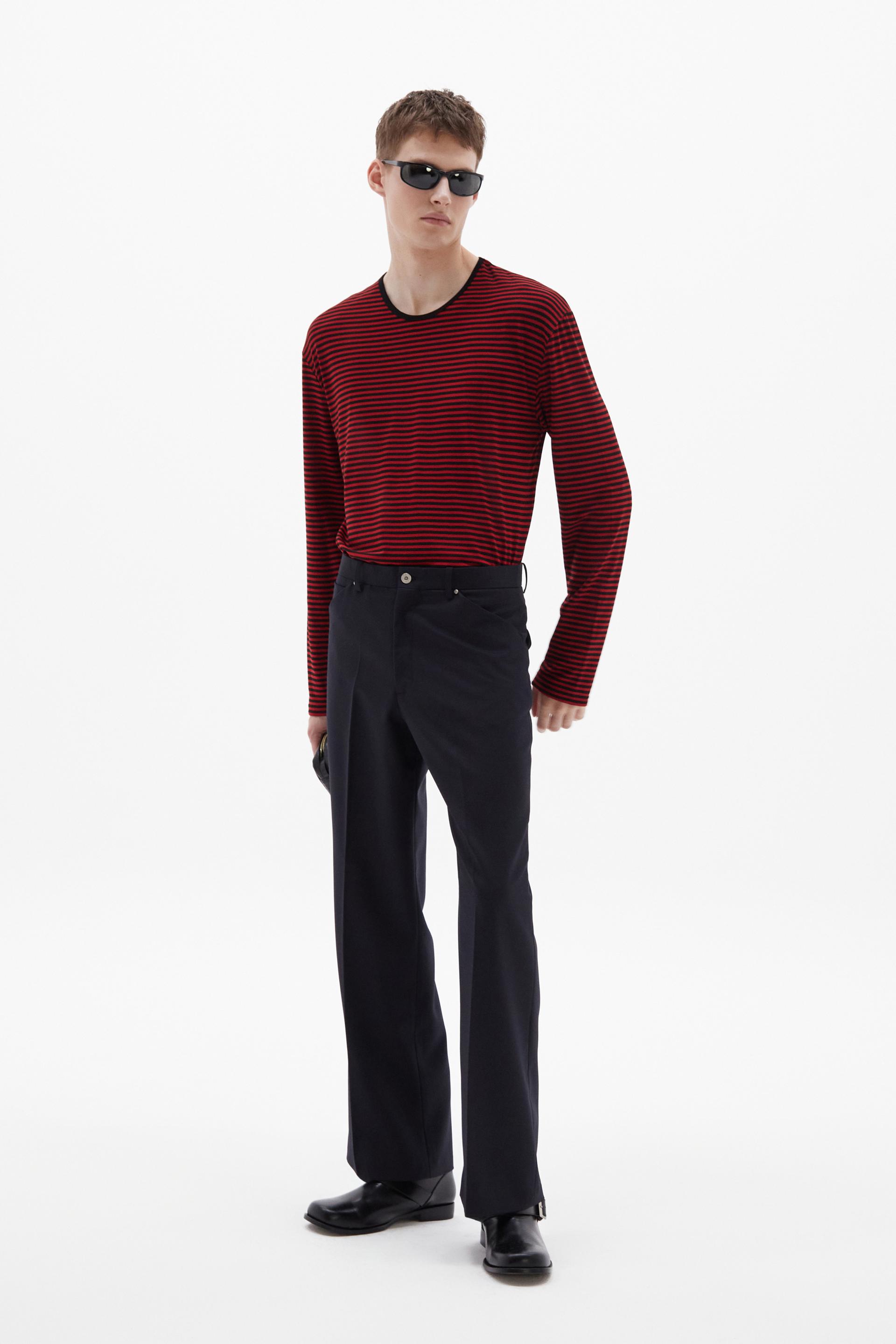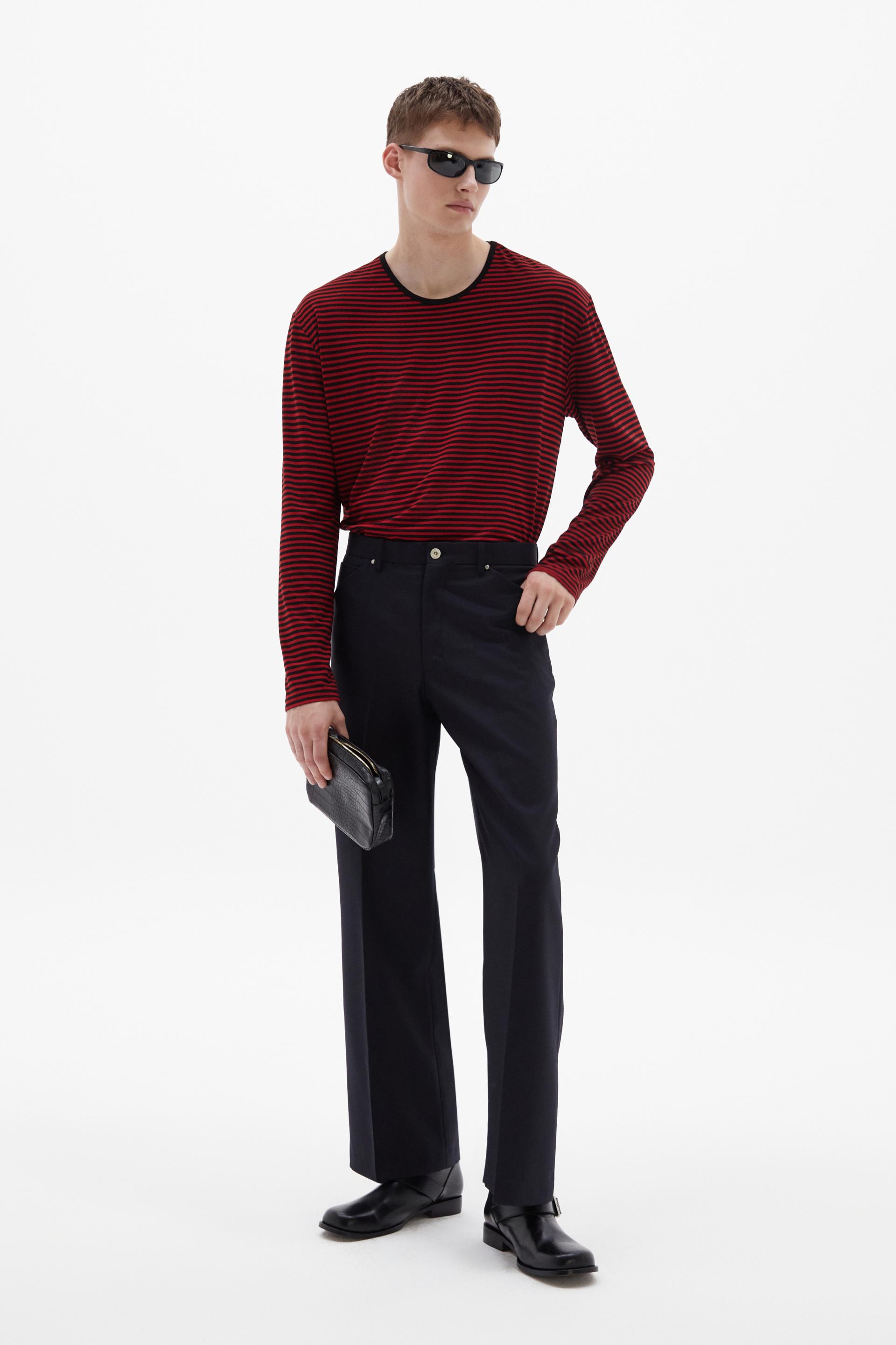 70년대 전반의 판탈론 패션과 시티 팬츠를 현대적으로 재해석한 트라우저 입니다. 탄탄한 밀도의 울 혼방 패브릭은 다리 라인을 따라 슬림하고 간결한 플레어 실루엣을 강조합니다. 콘초 스터드로 마감된 포켓과 벨트라인 타일레 블랙 라벨이 장식되어 있습니다.
