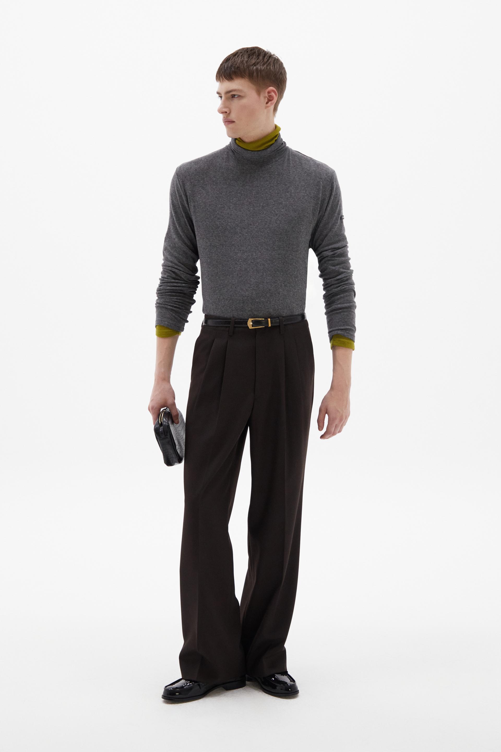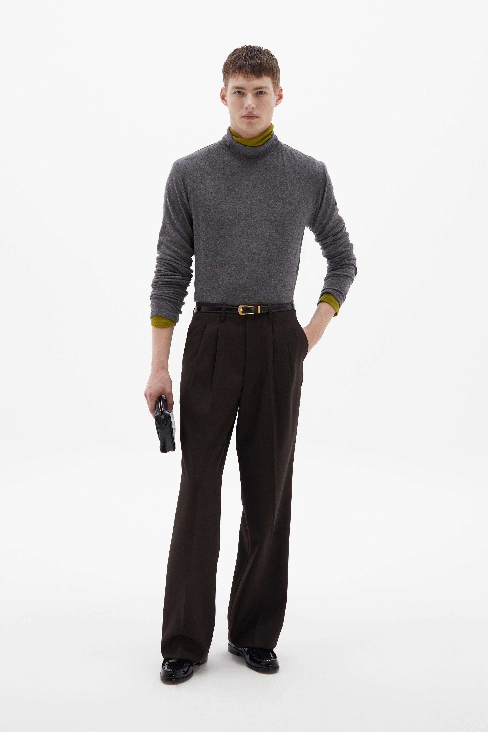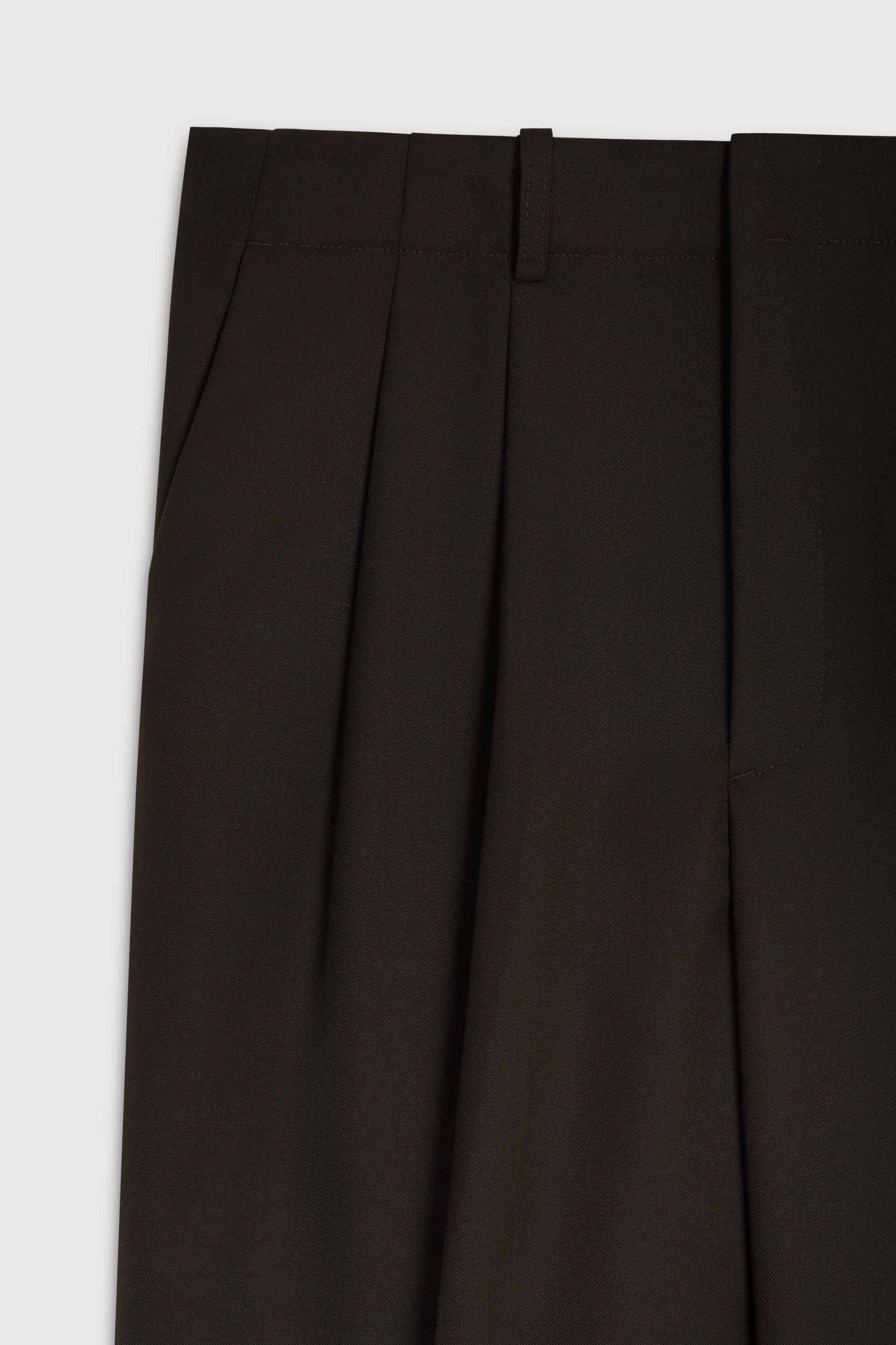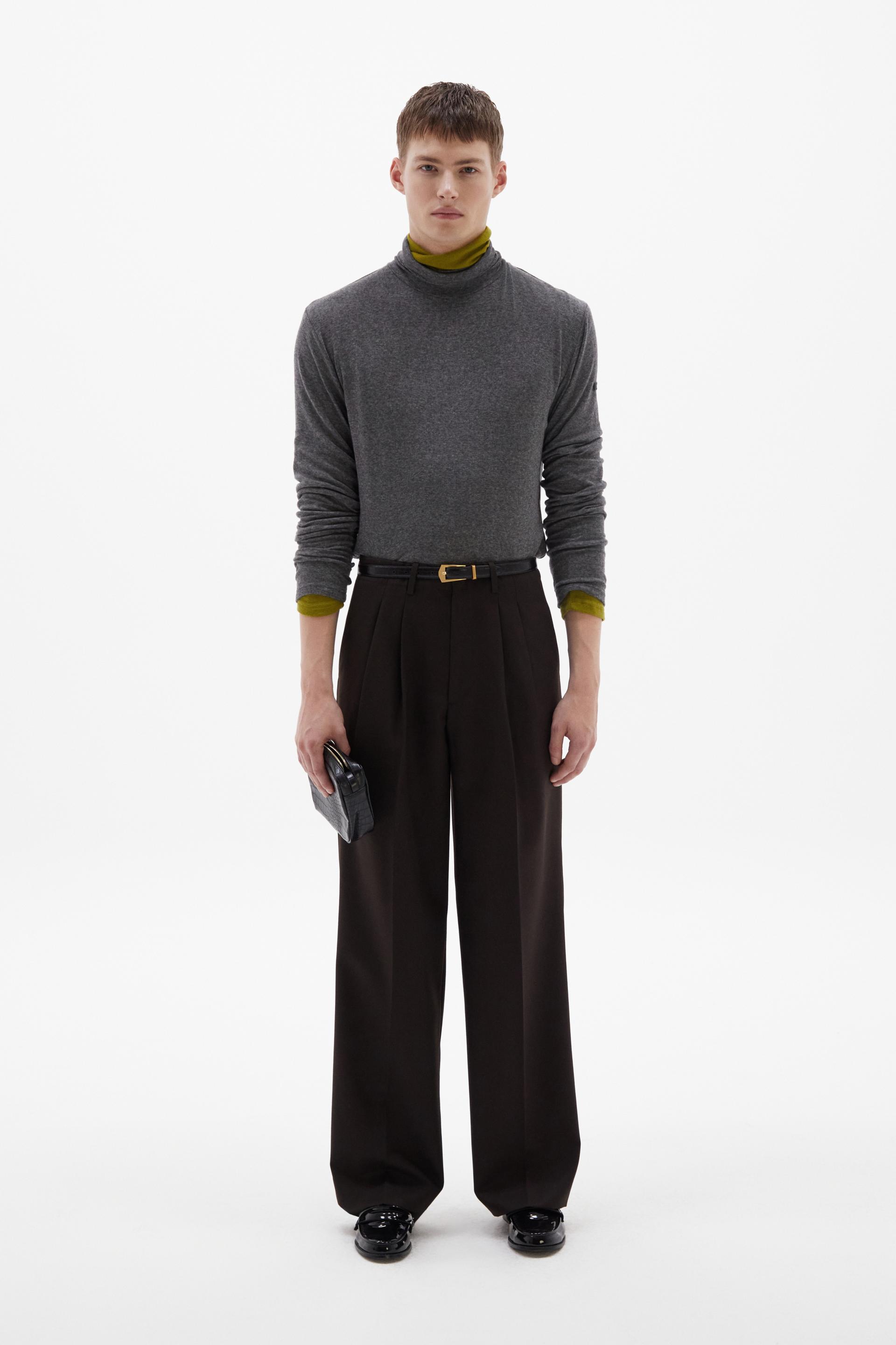 여유로운 실루엣의 테일러드 트라우저 입니다. 두 개의 플리츠가 볼륨을 유지하는 벨트리스 디자인, 밑단으로 넓은 와이드 레그 실루엣이 특징입니다. 탄탄한 직조의 울 혼방 패브릭과 테일러드 베이스로 완성한 클래식 트라우저로 시간에 구애받지 않는 타임리스 아이템입니다.