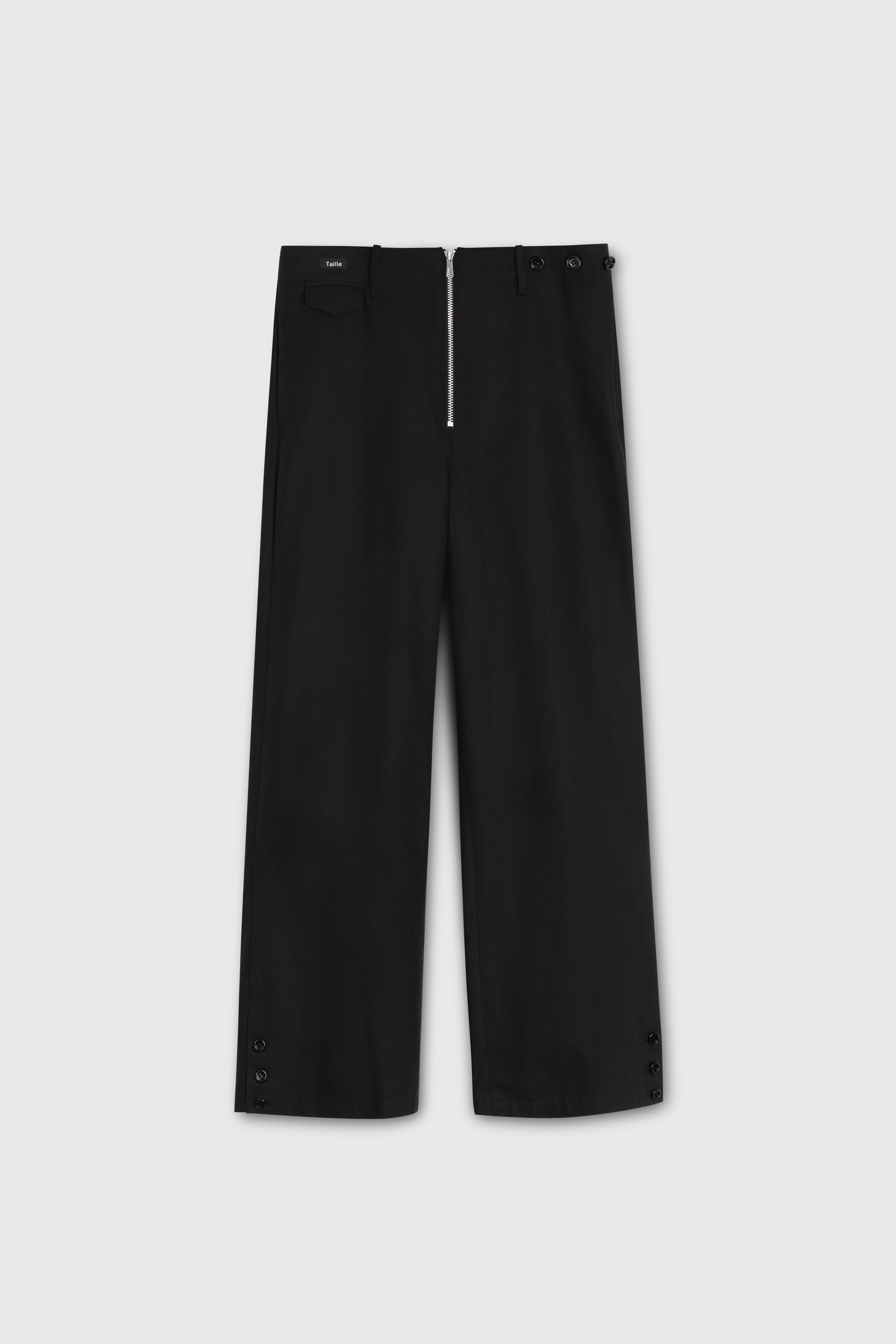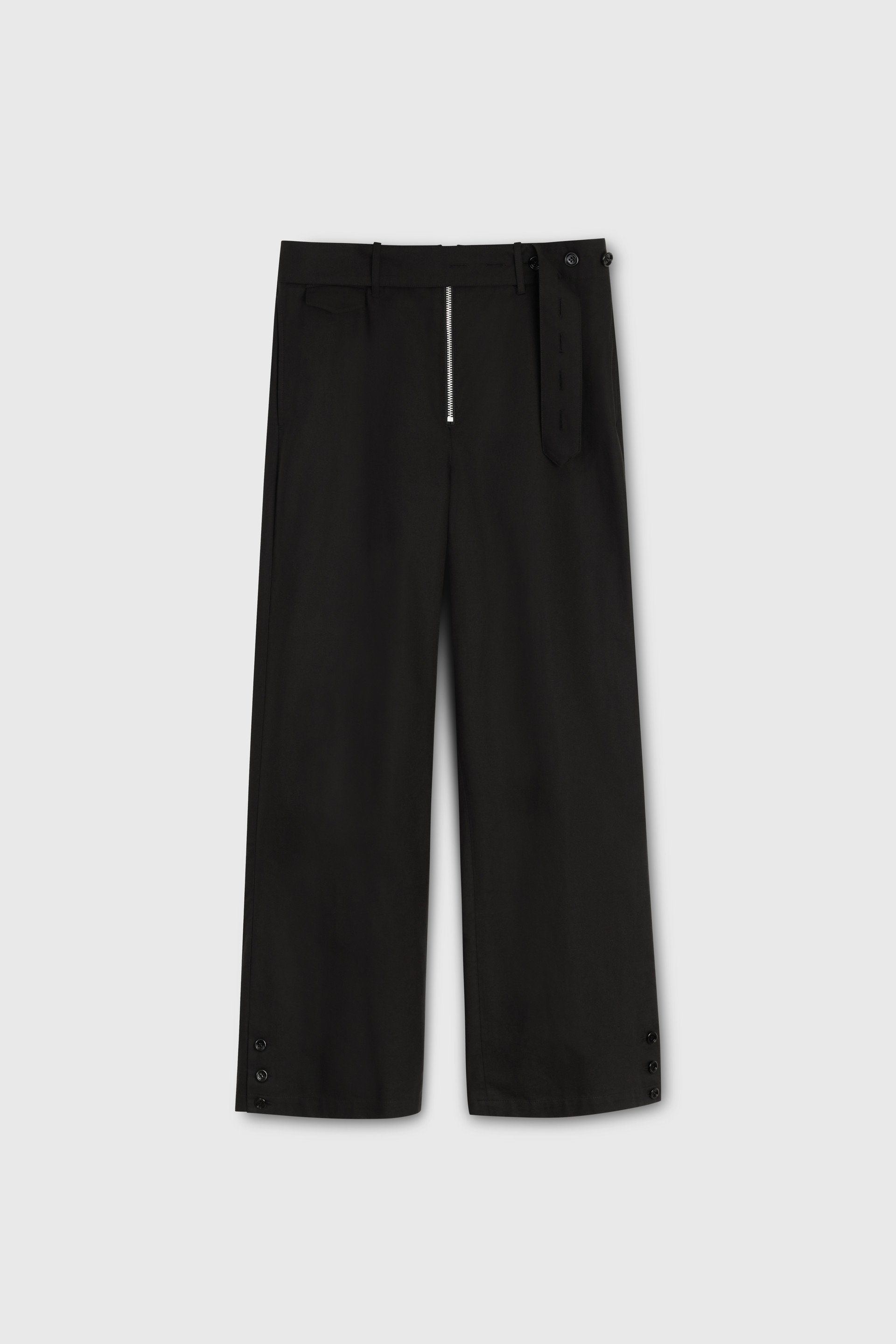 70년대 프렌치 밀리터리 Theraml 팬츠를 제한적인 디테일로 재해석한 팬츠입니다. 현대적인 터치의 코튼 레이온 혼방 패브릭과 여유로운 와이드 레그 실루엣이 조화롭게 세련된 분위기를 구성합니다. 오리지널의 전형인 노출된 지퍼 클로즈 위로, 버튼을 자유롭게 활용할 수 있는 벨트가 더해졌습니다. 전면부 코인포켓과 허리사이즈를 조절 할 수 있는 다섯개의 버튼이 있으며 밑단의 플라켓으로 다양한 실루엣 연출이 가능합니다.