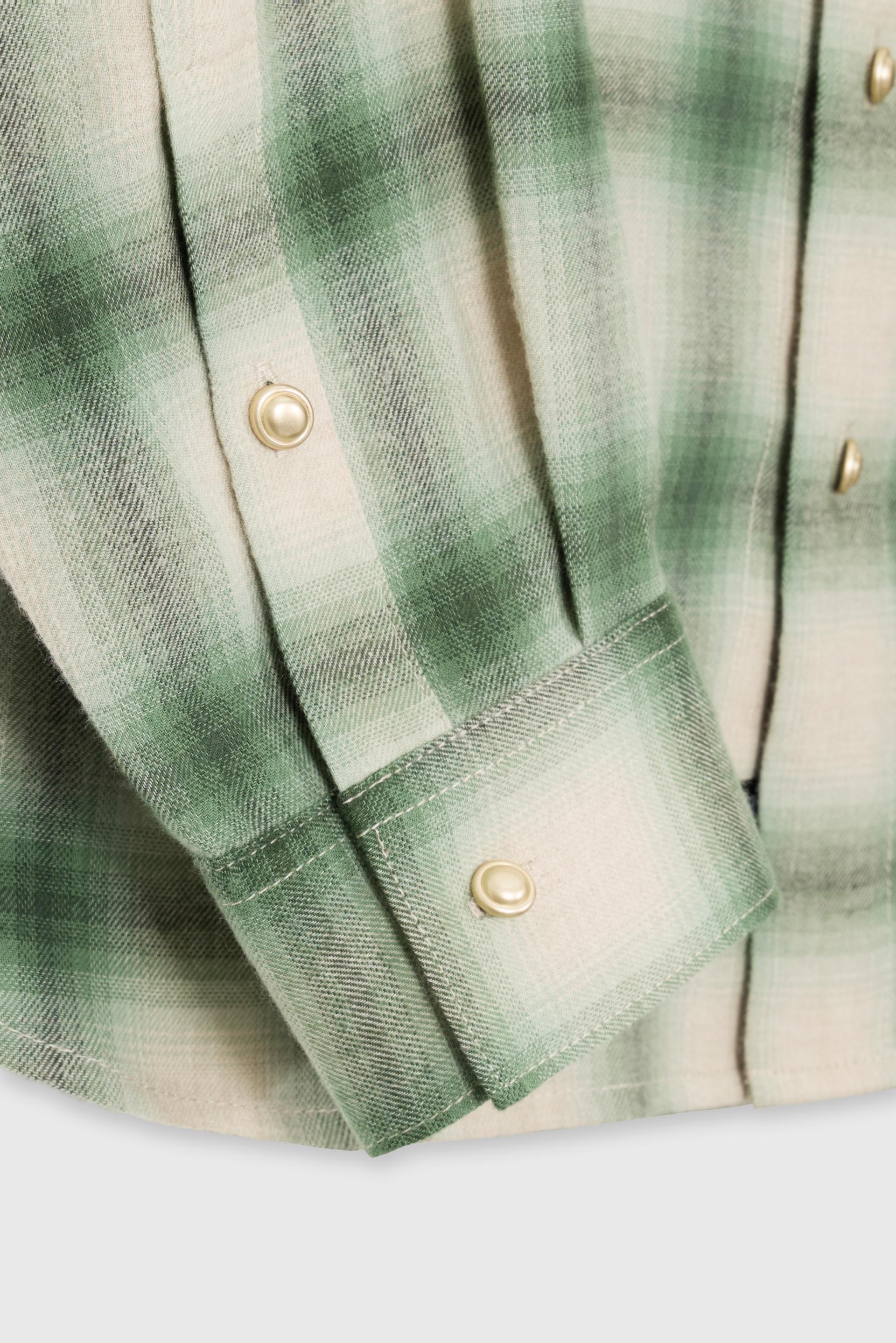 빈티지 컬러링과 세밀한 체크 직조가 돋보이는 울 코튼 혼방 패트롤 셔츠입니다. 정돈된 채도의 로열 그린 컬러와 빈티지 이팩트를 더한 골드 버튼이 시네마틱한 분위기를 연출합니다. 전면부 두 개의 밀리터리 포켓과 스탠다드 칼라에 레귤러 핏 타입이며 시간에 구애받지 않는 소재와 디자인의 클래식 아이템입니다.