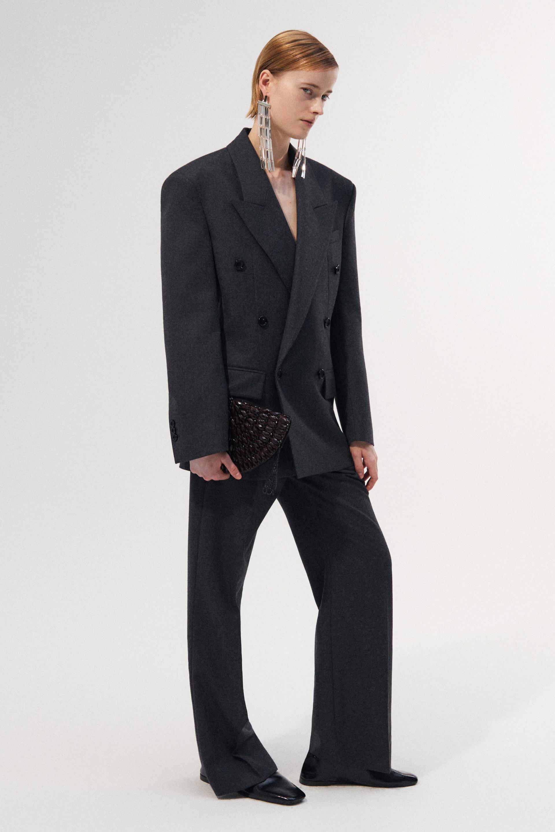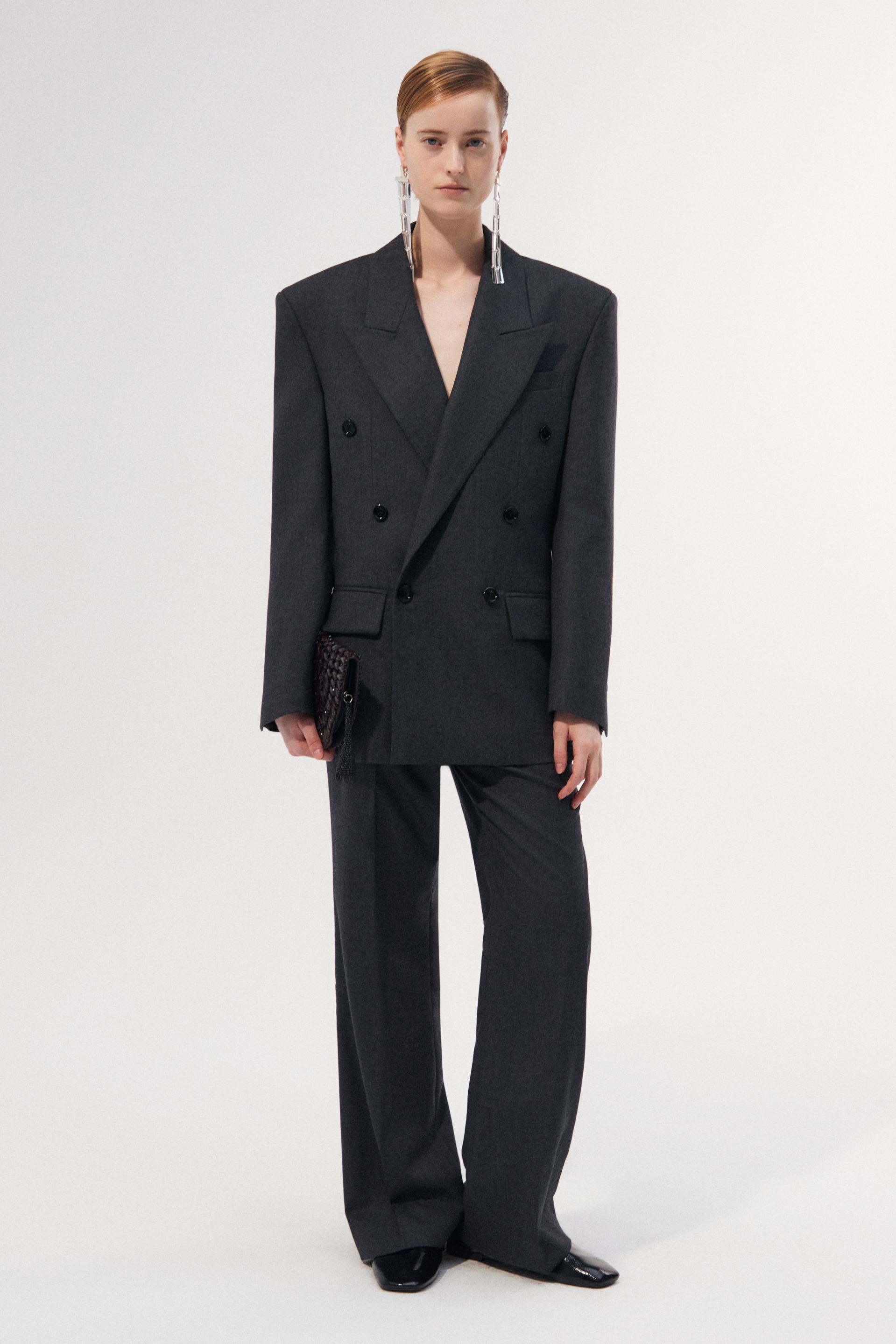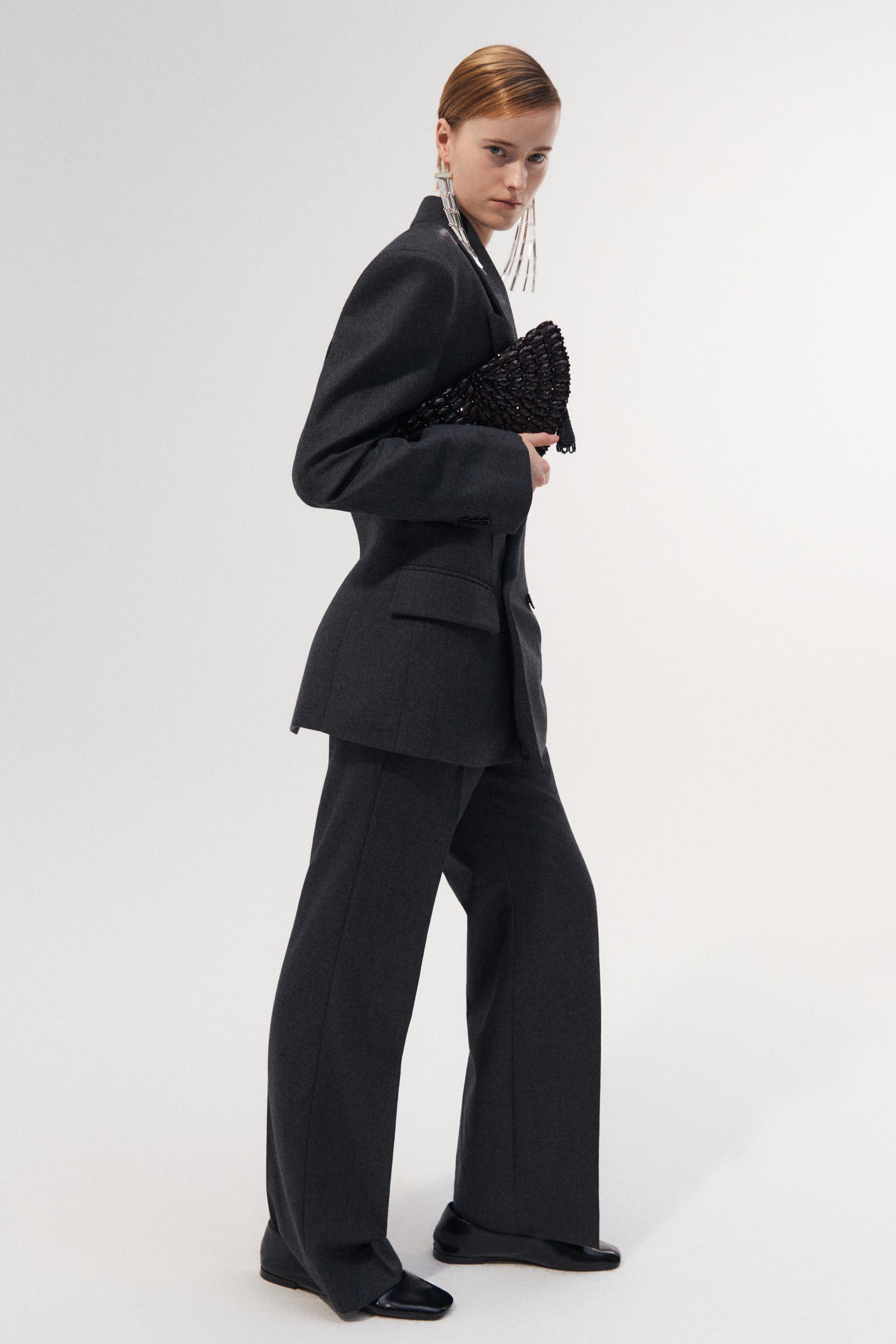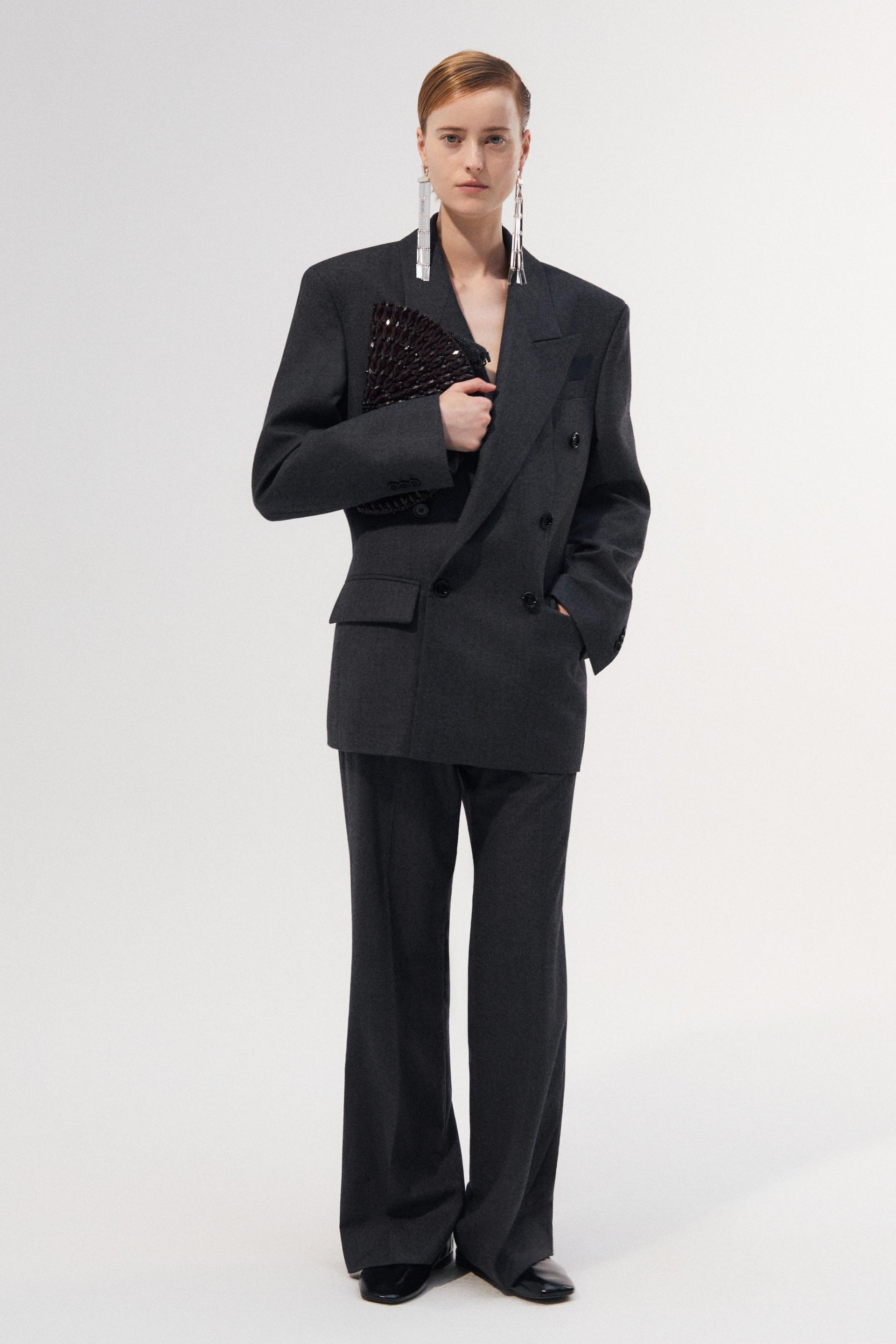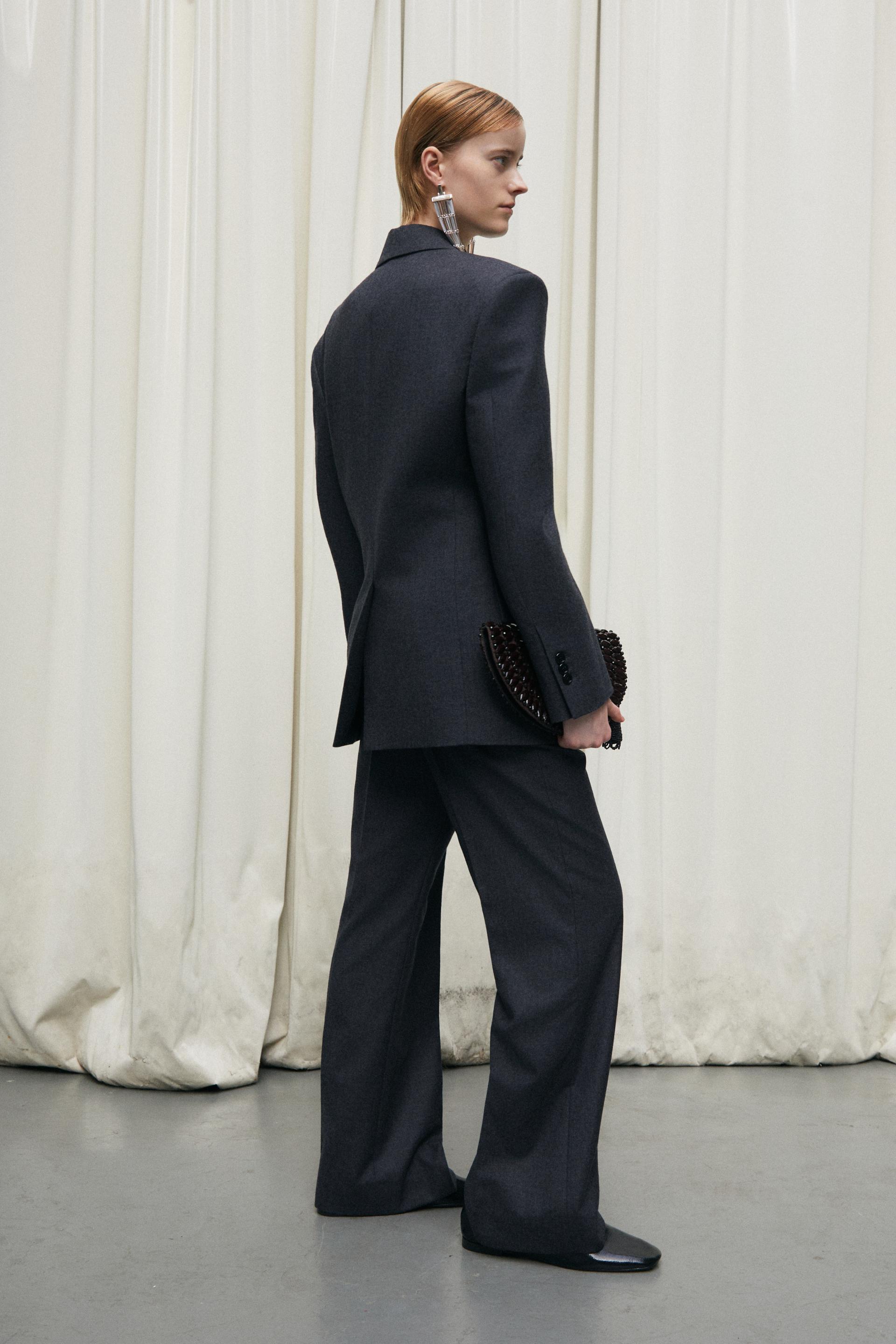 타일레 시그니처 아이템, 60년대 카나비 스트리트 룩에서 영감을 얻은 울 트라우저 입니다. 소프트한 터치와 우아한 광택이 돋보이는 파인 울 플란넬 패브릭을 사용했습니다. 밑단으로 넓어지는 와이드 플레어 실루엣과 벨트 루프에 더해진 콘초 스터드가 세련된 대비를 연출합니다. 내부 마감까지 테일러드 메이킹으로 완성한 하이 퀄리티 클래식 아이템입니다.