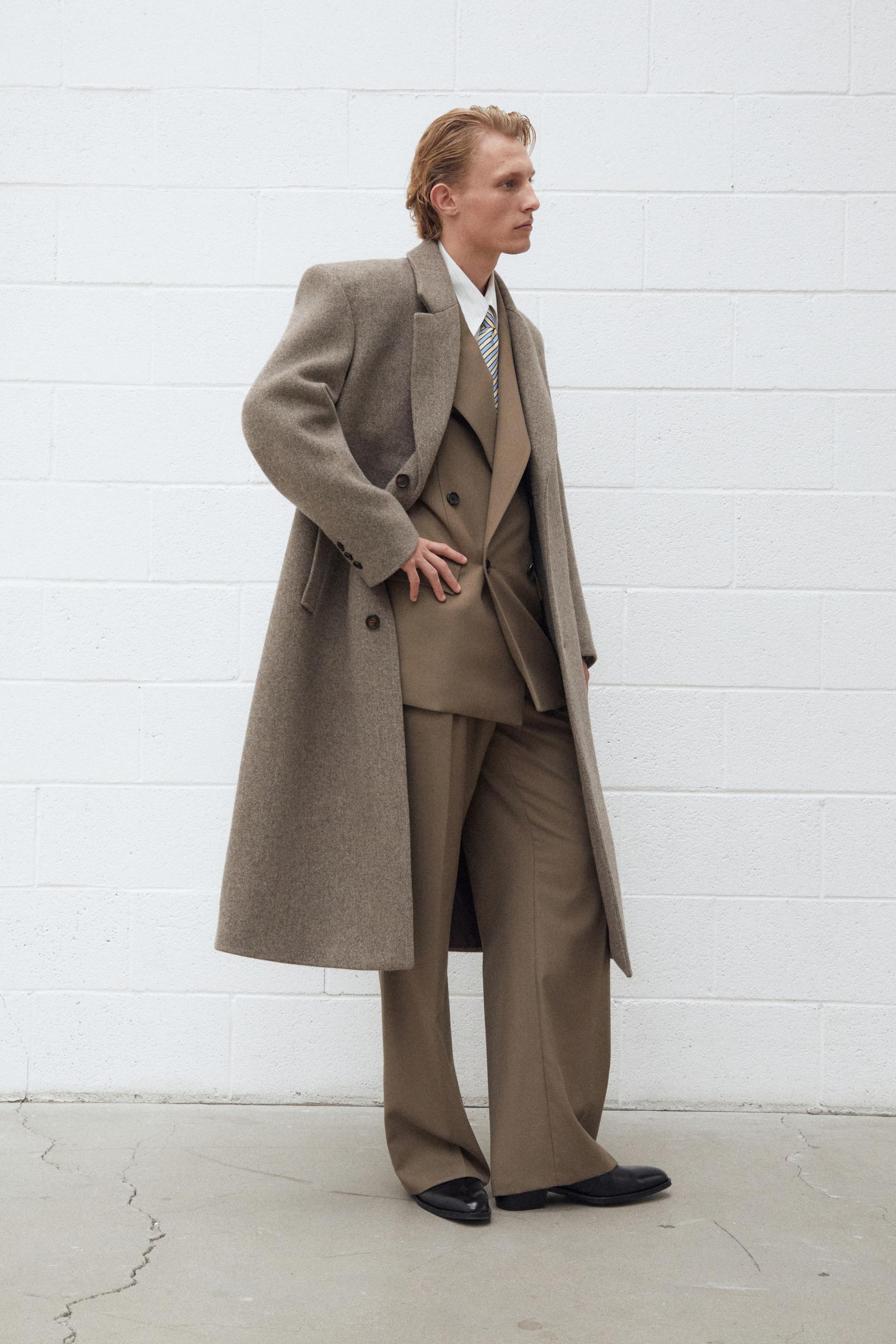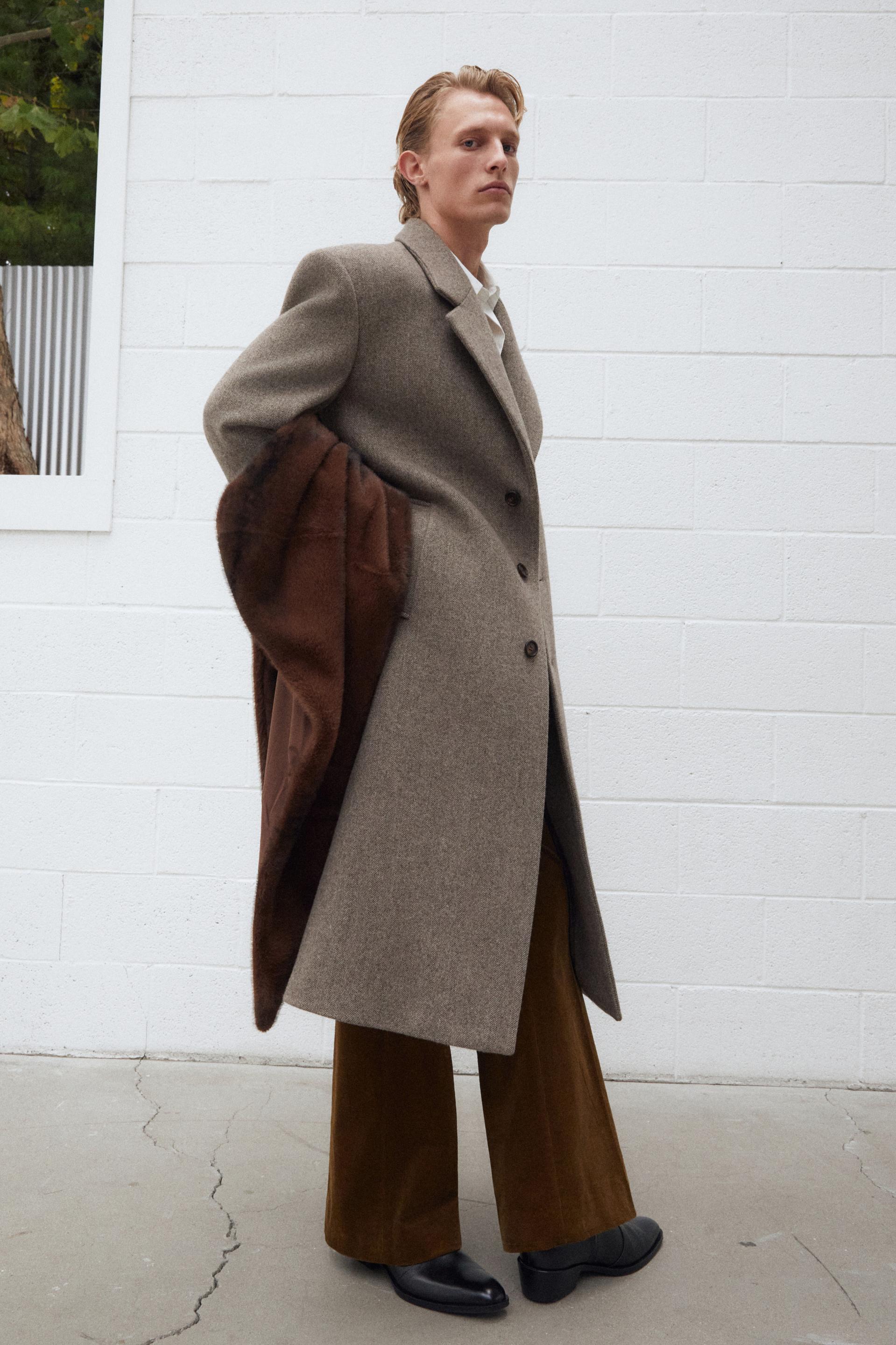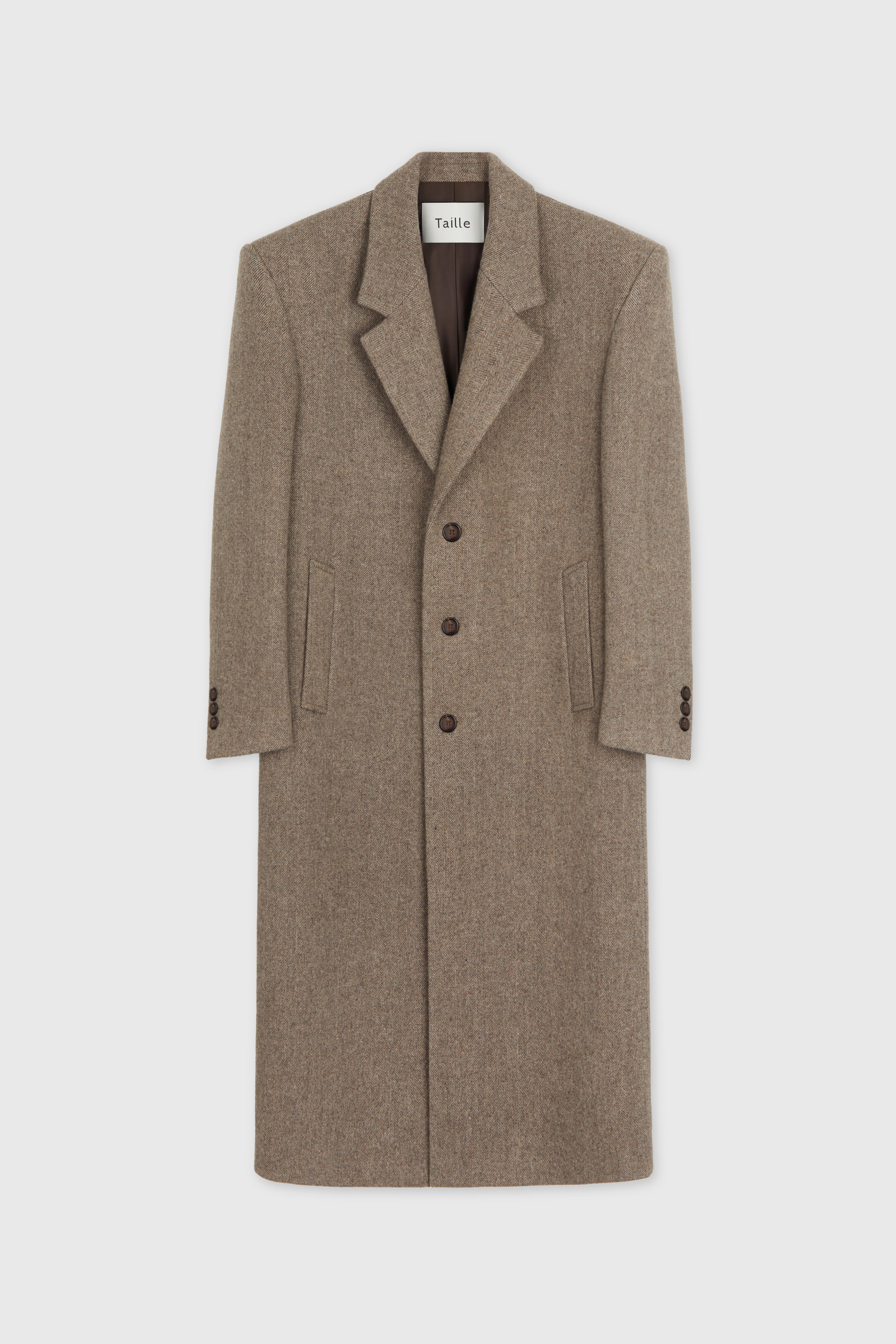 타일레 시그니처 코트 컬렉션, 섬세한 헤링본 조직과 탄탄한 터치가 돋보이는 멜톤 울 소재 테일러드 코트입니다. 정교한 테일러링이 돋보이는 박스 실루엣의 숄더라인에 자연스러운 드레이프가 우아한 분위기를 연출합니다. 싱글 브레스티드 포맷에 노치드 라펠, 르뎅고트를 오마주한 구조적인 V 테이퍼드 실루엣과 볼륨있는 소매의 섬세한 곡선이 특징입니다. 사토리얼 베이스로 완성된 하이 퀄리티 클래식 코트로 소매에는 리얼버튼이 적용되었고 사용된 단추는 모두 천연 소뿔단추입니다.