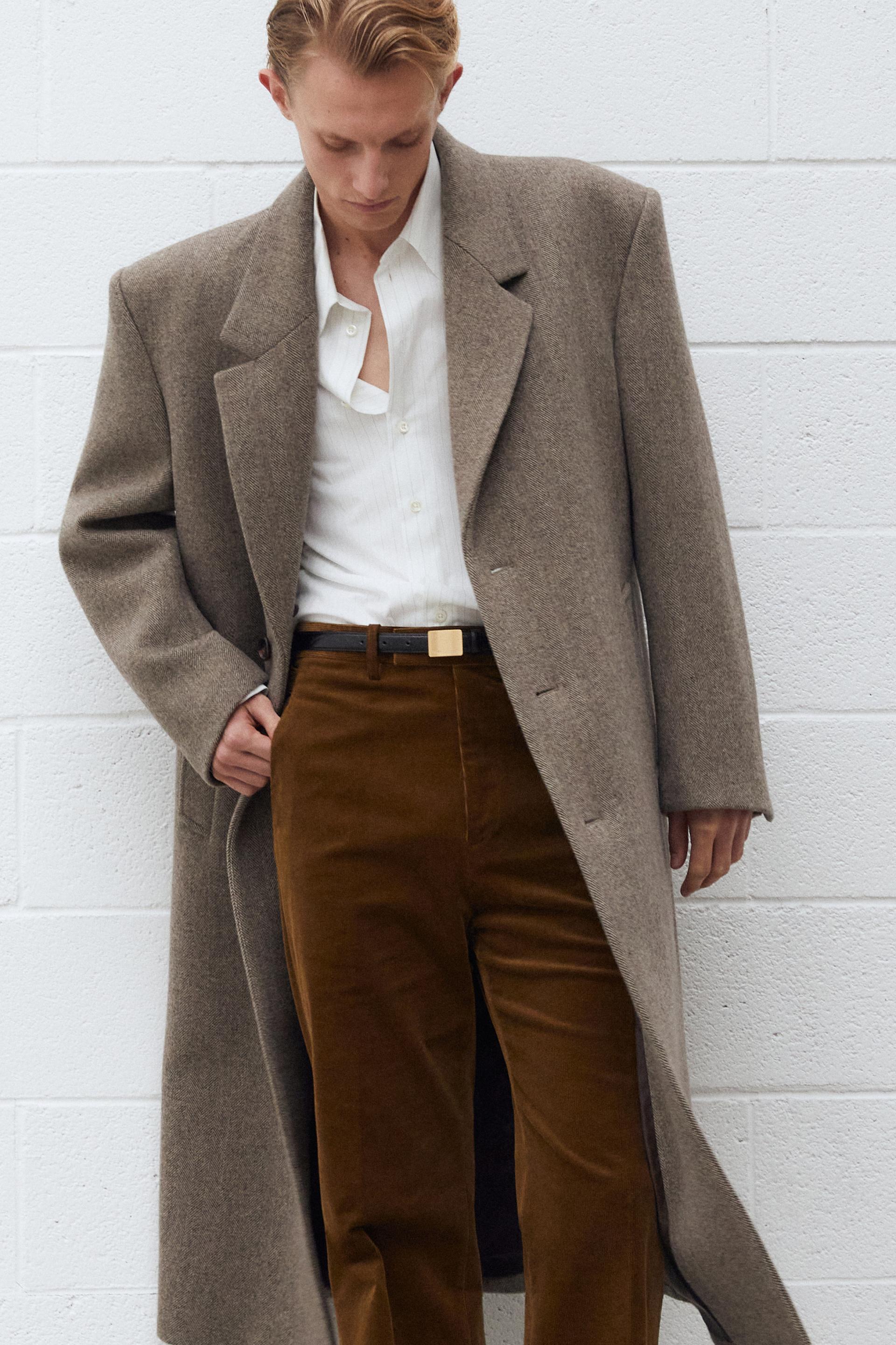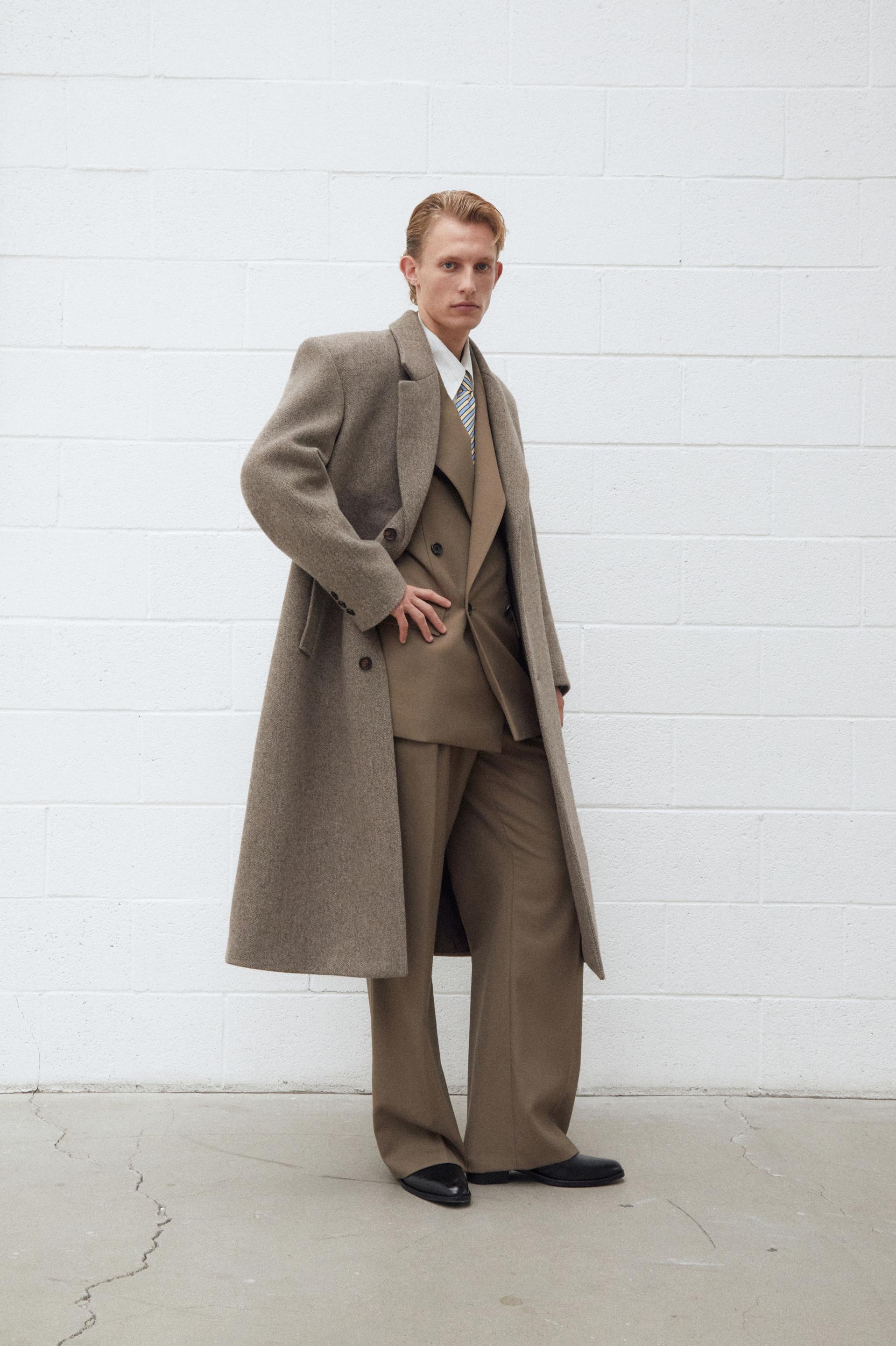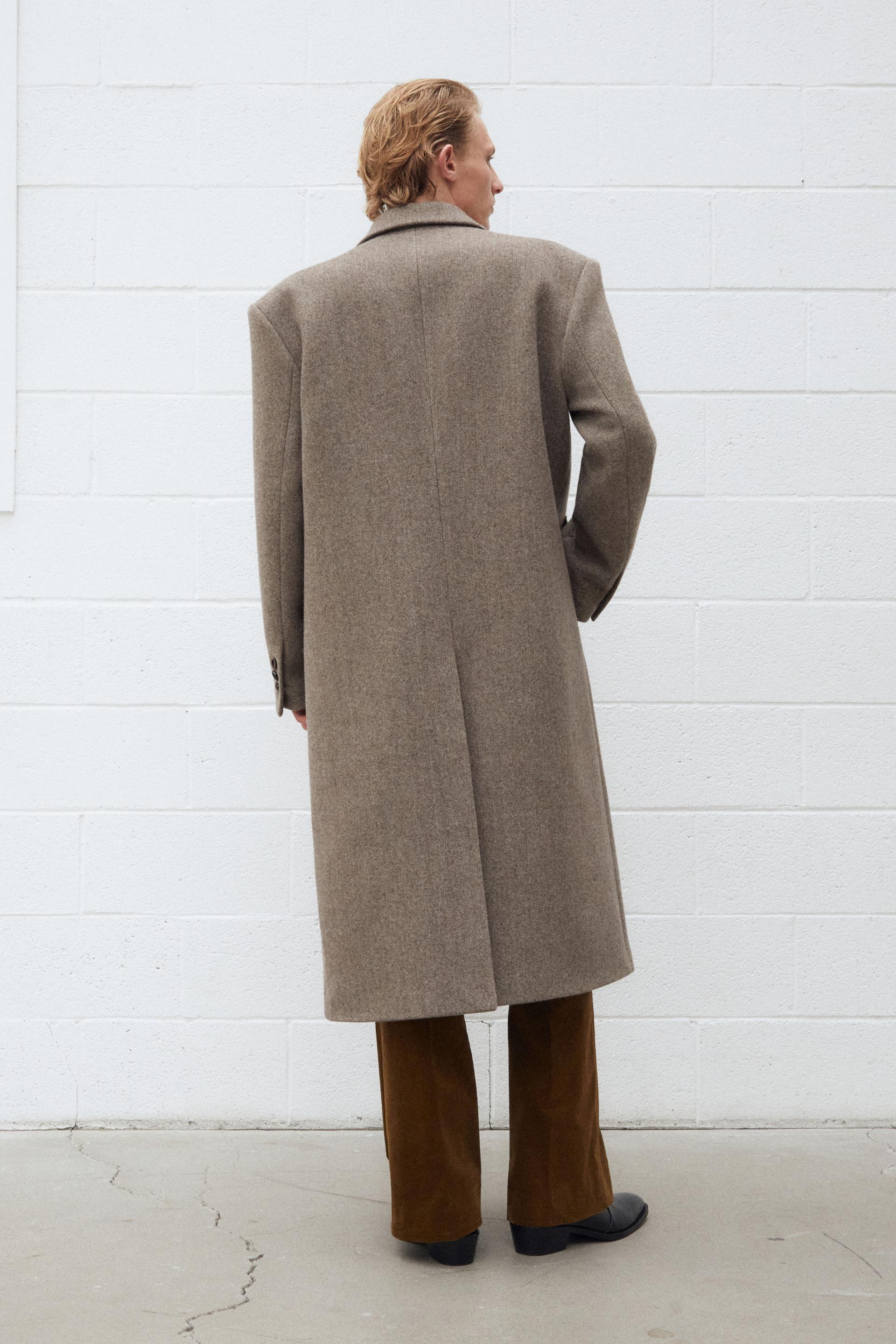타일레 시그니처 코트 컬렉션, 섬세한 헤링본 조직과 탄탄한 터치가 돋보이는 멜톤 울 소재 테일러드 코트입니다. 정교한 테일러링이 돋보이는 박스 실루엣의 숄더라인에 자연스러운 드레이프가 우아한 분위기를 연출합니다. 싱글 브레스티드 포맷에 노치드 라펠, 르뎅고트를 오마주한 구조적인 V 테이퍼드 실루엣과 볼륨있는 소매의 섬세한 곡선이 특징입니다. 사토리얼 베이스로 완성된 하이 퀄리티 클래식 코트로 소매에는 리얼버튼이 적용되었고 사용된 단추는 모두 천연 소뿔단추입니다.