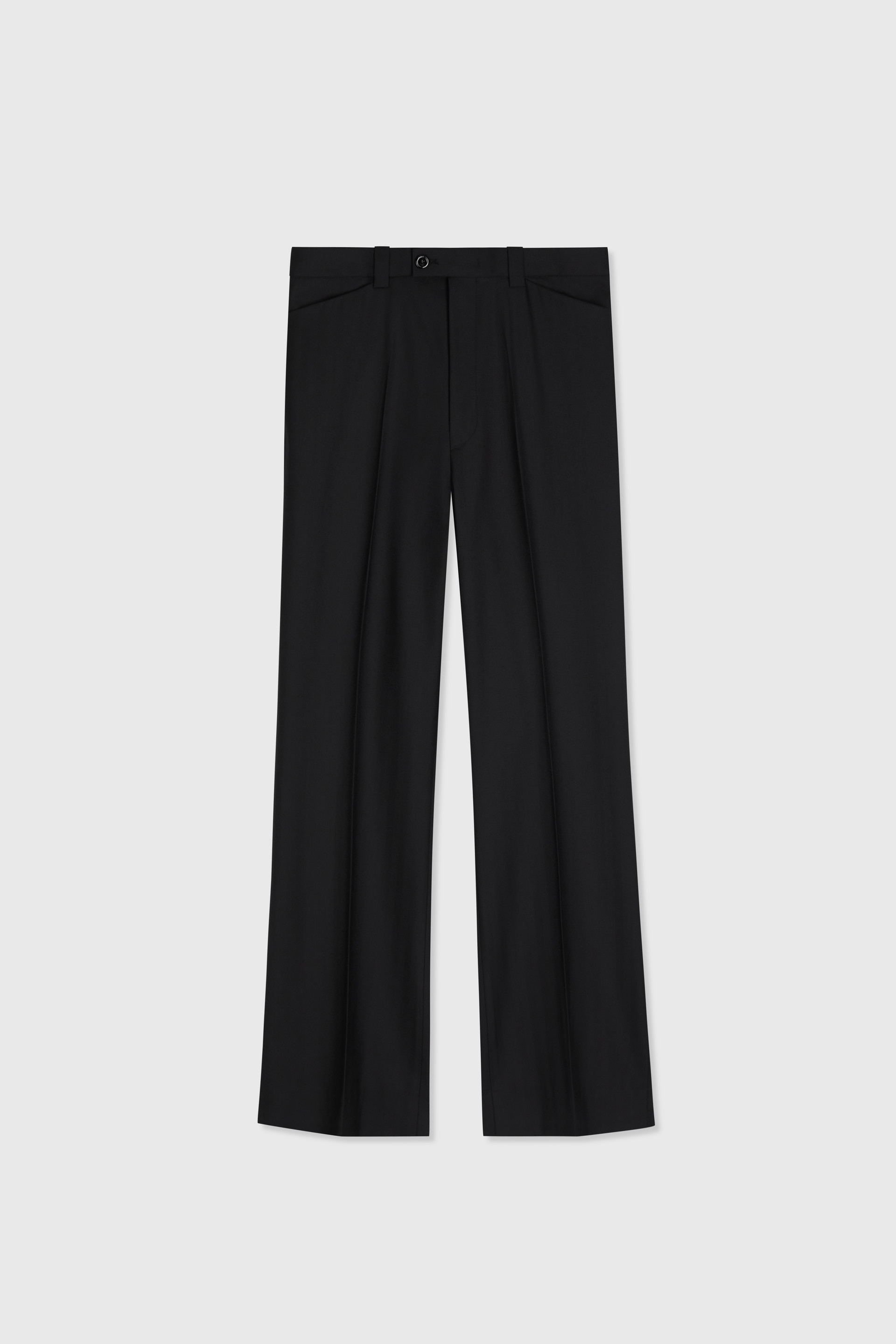 입체적인 곡선과 간결한 플레어 실루엣이 돋보이는 벨 트라우저입니다. 80년대 실루엣을 오마주한 레귤러 라이즈 패턴과 길게 흐르는 드레이프는 다리 라인을 강조하며 빈티지한 분위기를 연출합니다. 전면의 프로그 마우스 포켓과 버튼 다운 밴드가 있으며 테일러드 메이킹으로 완성했습니다.